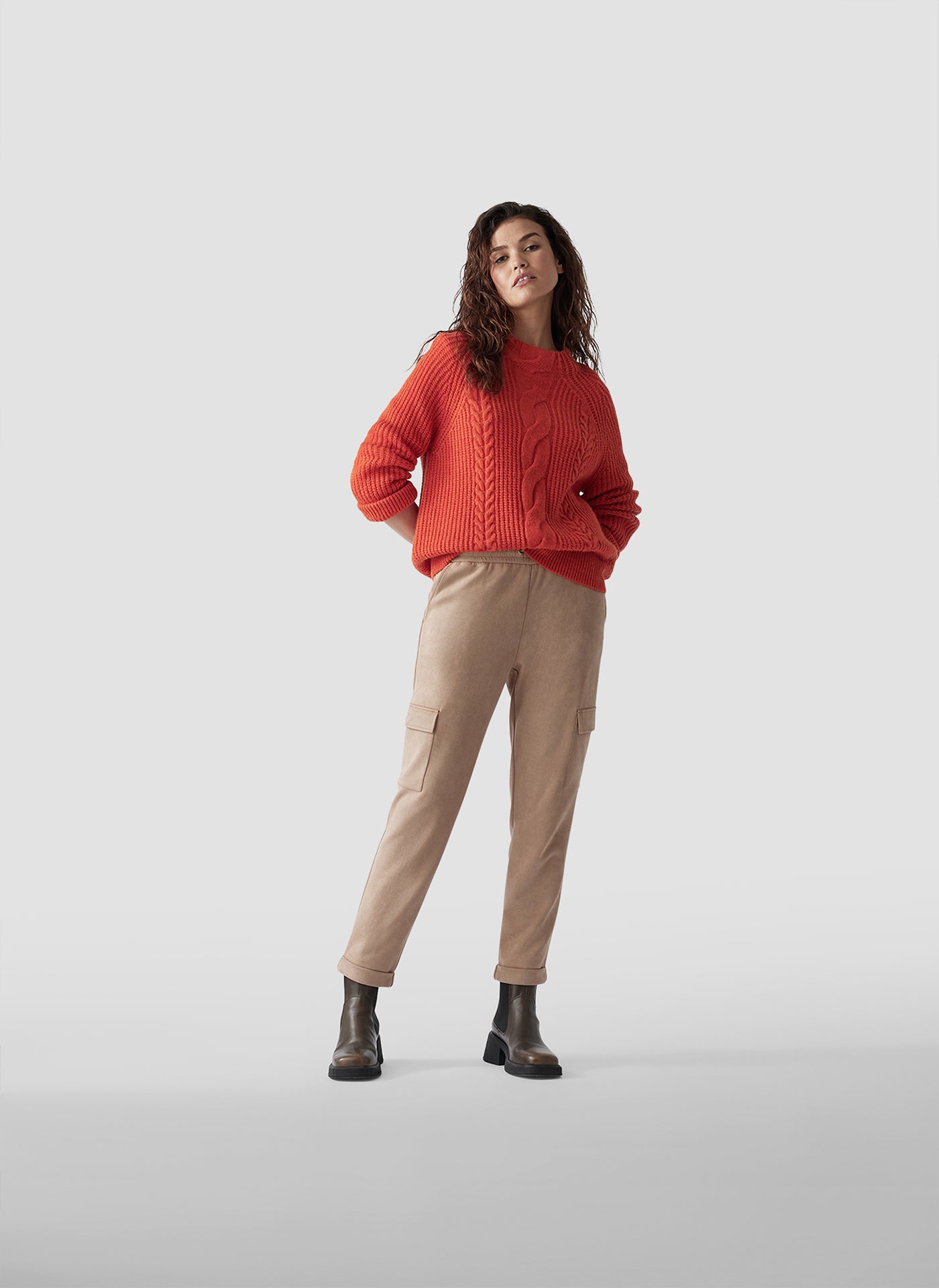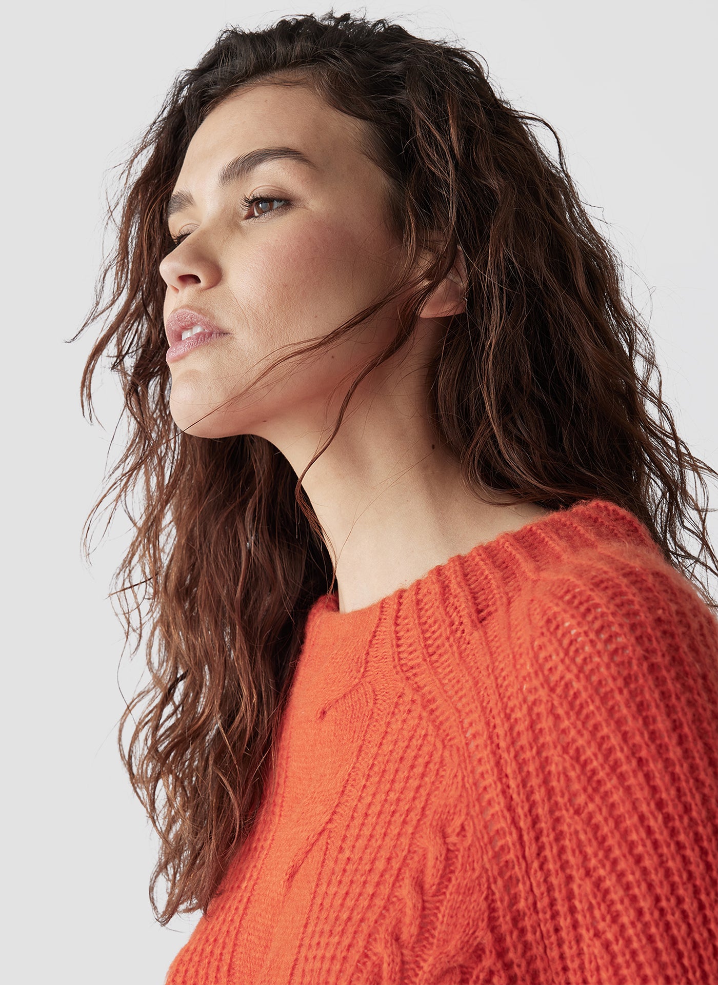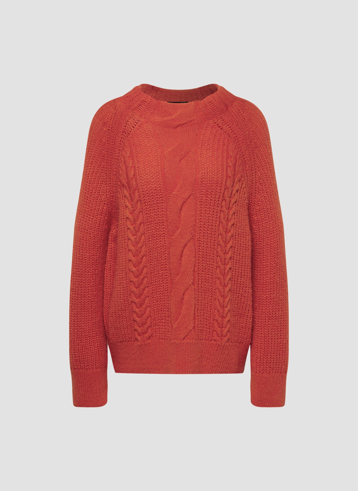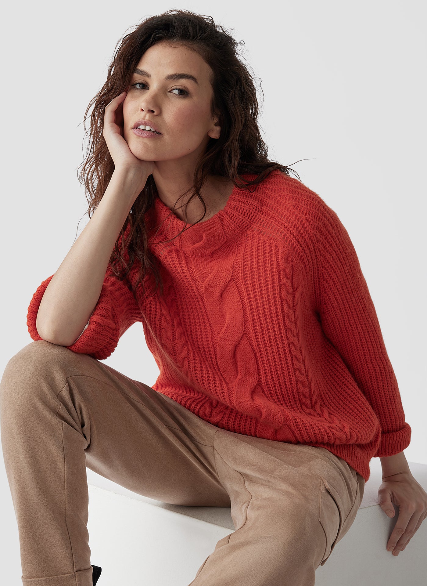 Stylischer Zopfstrick-Pullover in leuchtendem Orange _ Dieser Pullover kombiniert klassisches Zopfstrick-Design mit einer modernen, frischen Farbe und bringt Wärme und Stil in jeden Look. Klassisches Design für zeitlose Eleganz und Struktur. Ein lebendiger Farbton, der jedem Outfit eine frische Note verleiht. Angenehm und wärmend, ideal für kalte Tage. Gerippte Abschlüsse _ An Saum und Ärmeln für eine optimale Passform. Rundhalsausschnitt _ Vielseitig kombinierbar für einen lässigen oder eleganten Look.