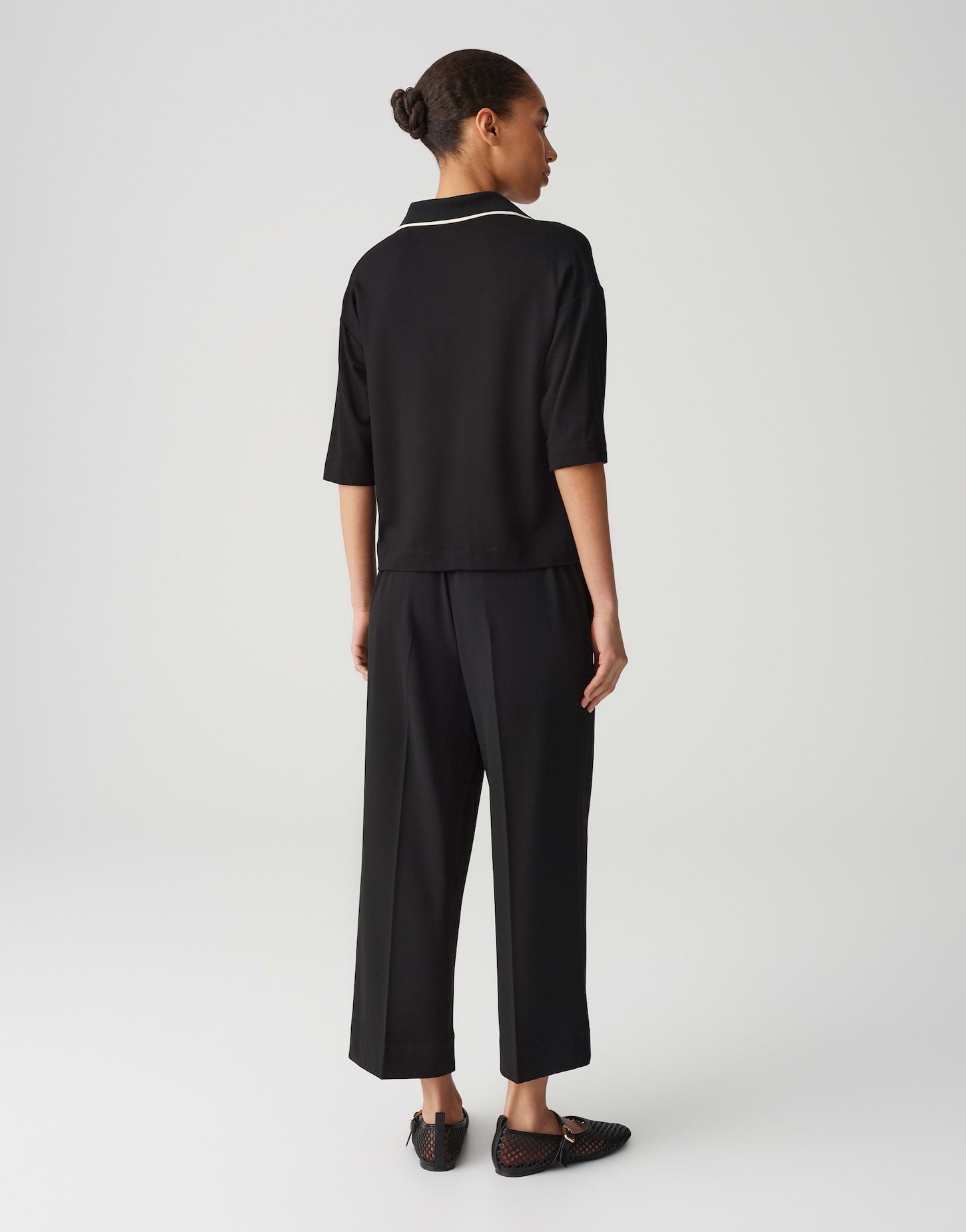 lockere Passform, gerader Schnitt, verkürzte Länge, überschnittene Schulter mit Halbarm, V-Ausschnitt, Polokragen, Rückenlänge ca. 55 cm bei Größe 36, Model Größe 175 cm – trägt Größe 36, Jersey, weicher Griff, fließender Fall, knitterarm