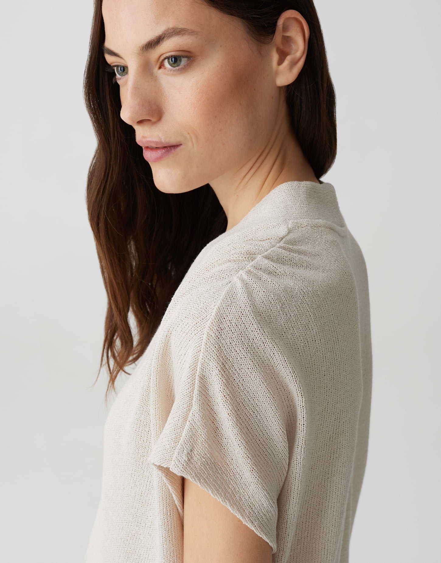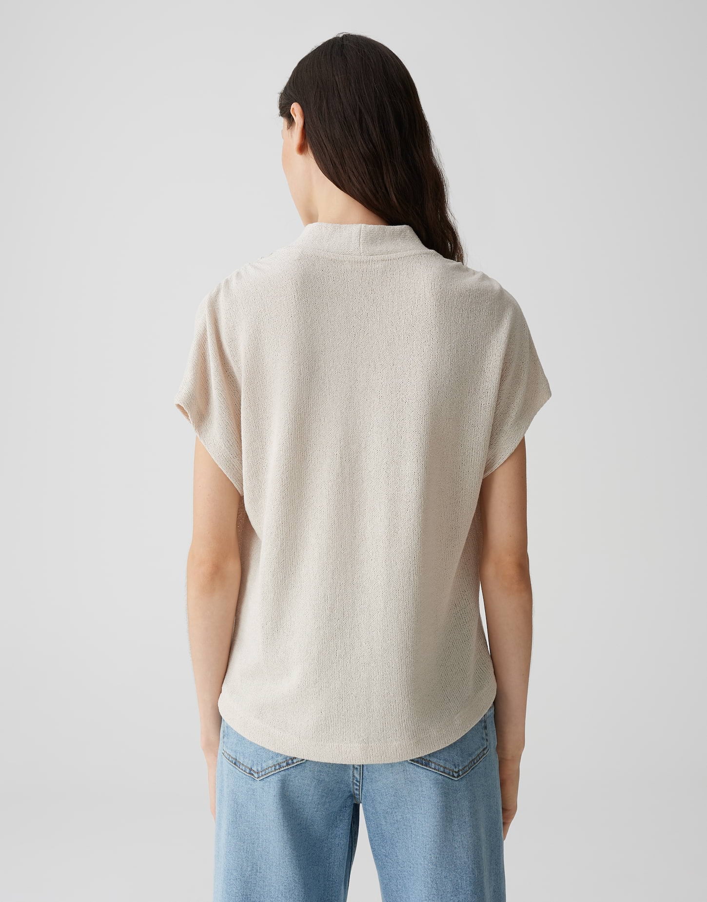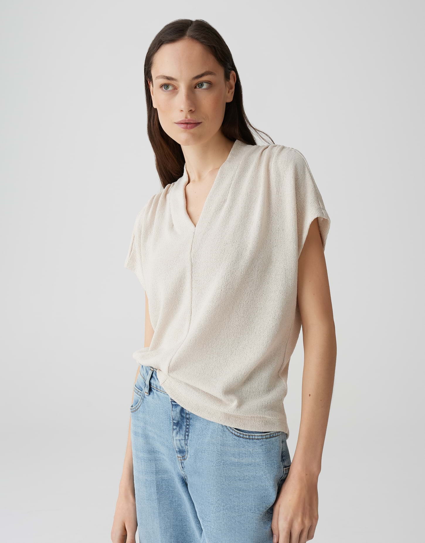 lockere Passform, gerader Schnitt, normale Länge, überschnittener Kurzarm, V-Ausschnitt, Rückenlänge ca. 56 cm bei Größe 36, Model Größe 178 cm – trägt Größe 36, Jersey, Strick Optik, natürlicher Griff, fließender Fall, Drapierung in der Schulter, Teilungsnaht vorn