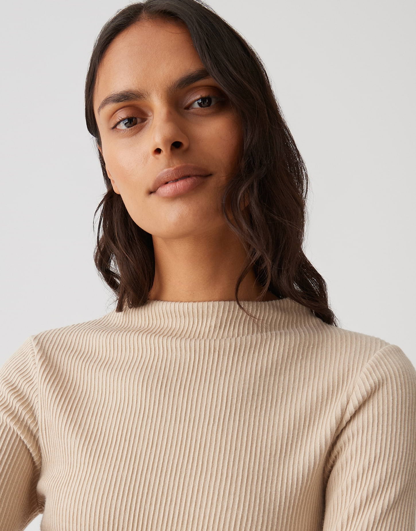schmale Passform, figurbetont geschnitten, Langarm, Funnel Neck, Rückenlänge ca. 63 cm bei Größe 36, Model Größe 178 cm – trägt Größe 36, Jersey, feine Rippstruktur, glatter Griff, elastischer Stoff, gewellte Kurbelkante