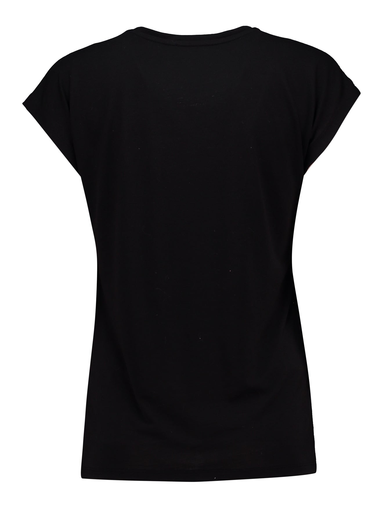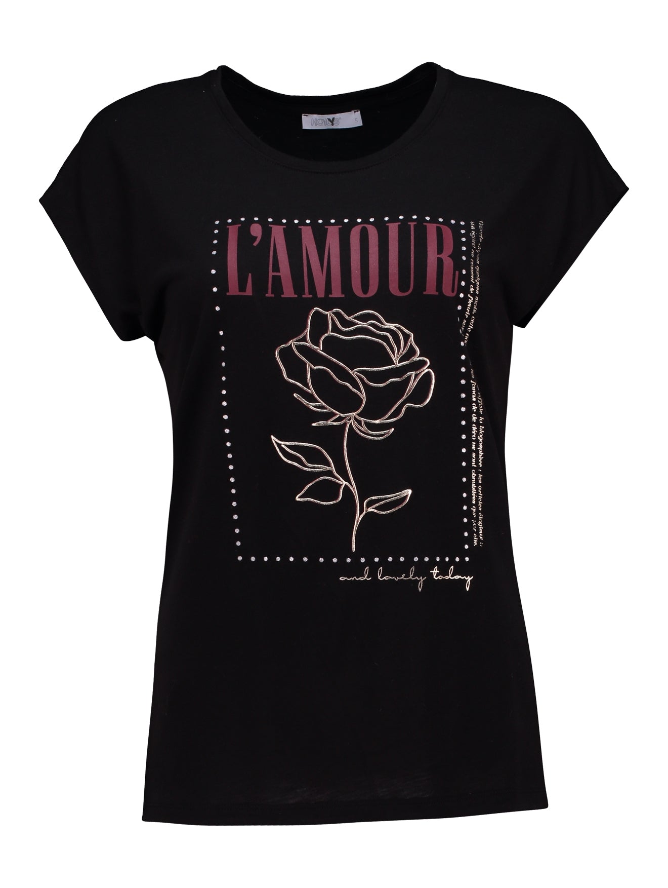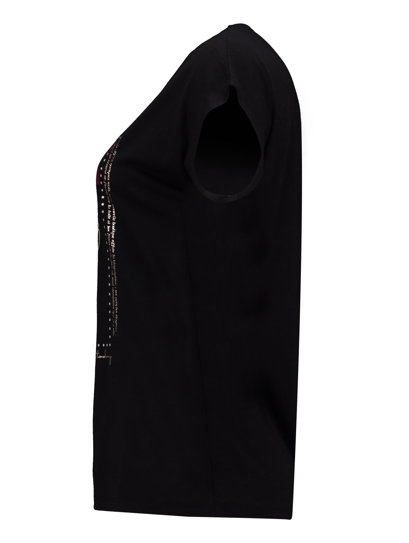 T-Shirt mit Print und Schmucksteinapplikationen.