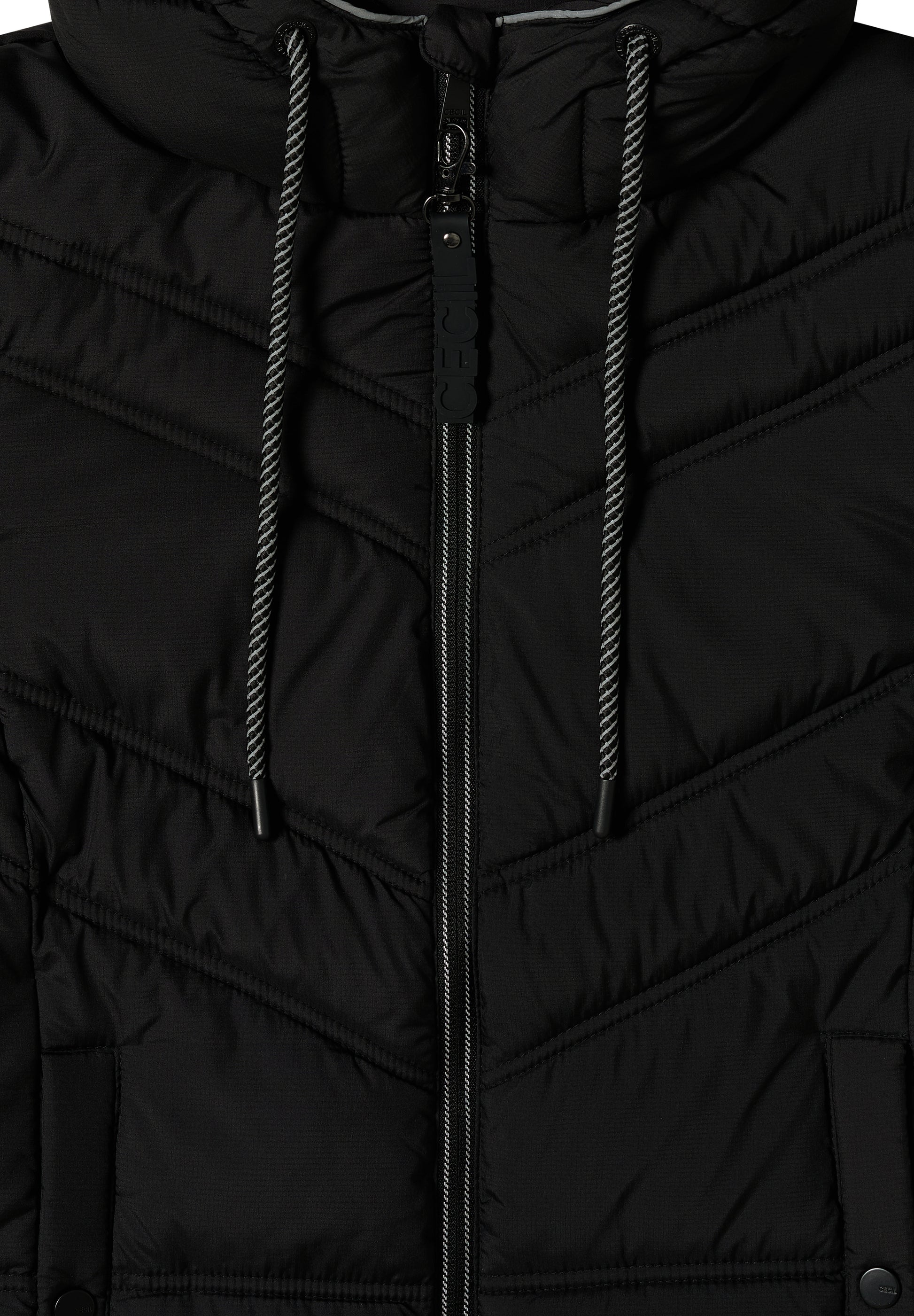 Diese Steppjacke von CECIL für Damen vereint funktionales Design mit sportivem Stil. Reflektierende Details, eine angesetzte Kapuze mit Tunnelzug sowie ein Stehkragen bieten Schutz bei Wind und Wetter. Eingesetzte Bündchen und wärmender Fleece in der Innentasche machen sie zum perfekten Begleiter für kalte Tage. Jacke mit reflektierenden Details Angesetzte Kapuze mit Tunnelzug und Stehkragen Seitliche Taschen mit Druckknopf Fleece in der Innentasche Eingesetzte Bündchen Material: Obermaterial: 100% Polyester; Futter: 100% Polyester; Füllung: 100% Polyester