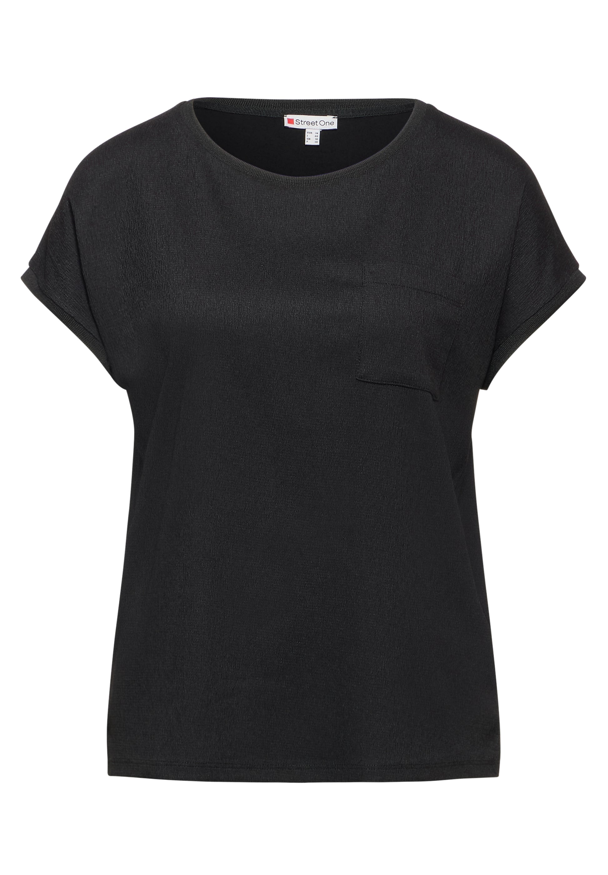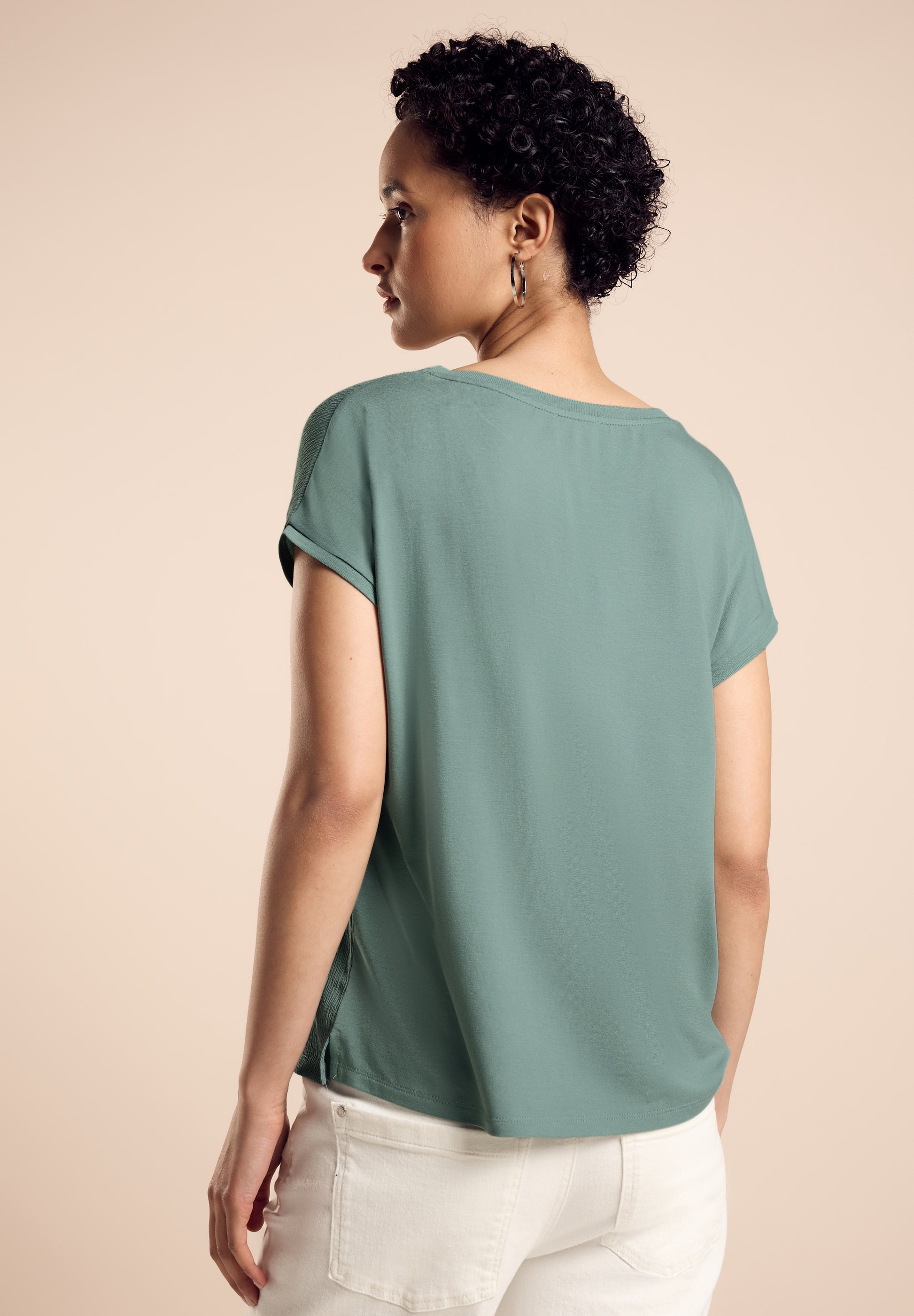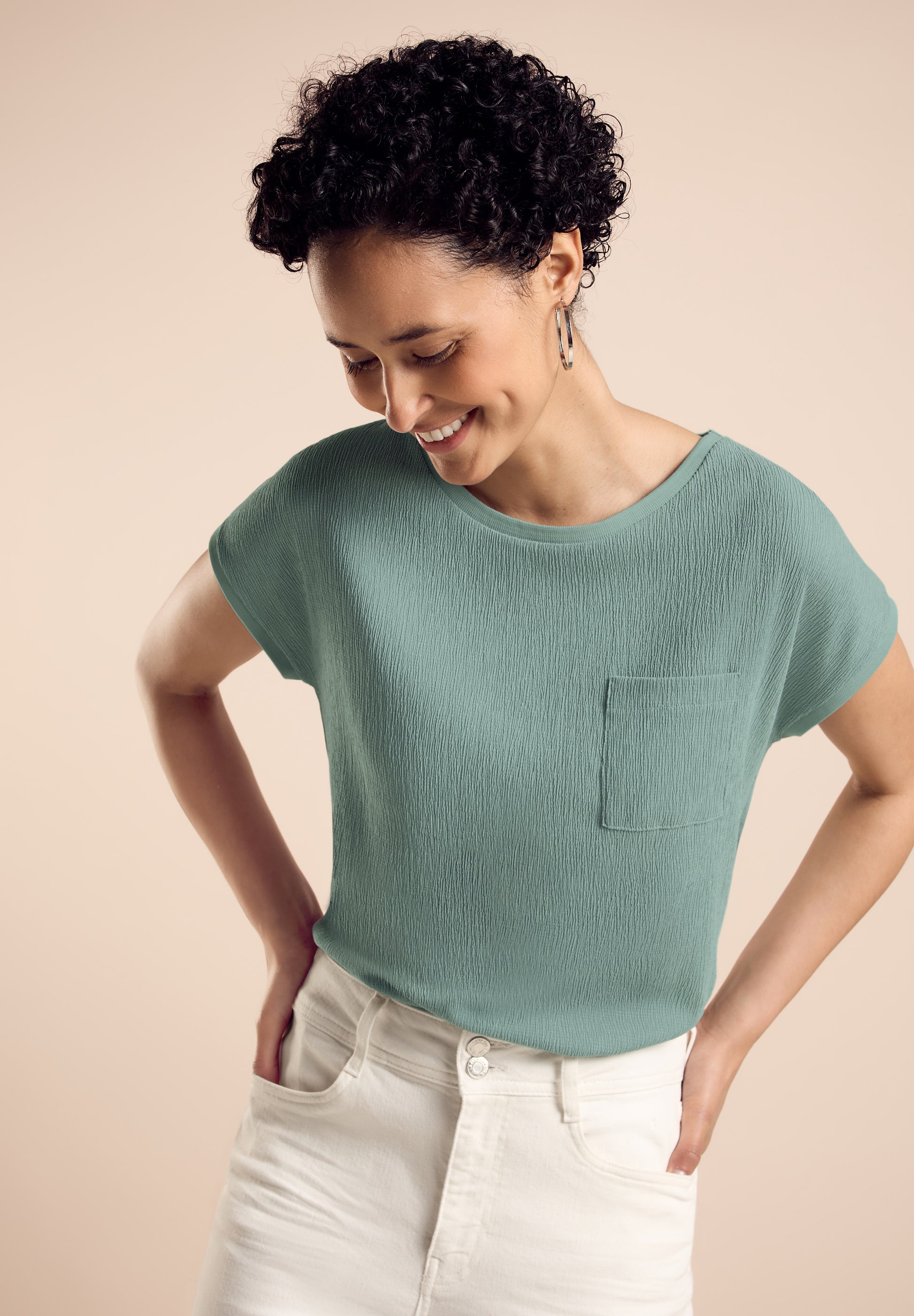 Das Strukturmix-Shirt von Street One für Damen bietet dank einer lockeren Passform einen angenehmen Tragekomfort. Details wie eine Brusttasche, der Rundhalsausschnitt oder der Armansatz mit Bündchen machen das Damenshirt zum vielseitigen Allrounder für dein Outfit. Damenshirt mit Brusttasche Armansatz mit Bündchen Rundhalsausschnitt Lockere Passform Vielseitiger Allrounder Material: 95% Livaeco™ Viscose, 5% Elasthan