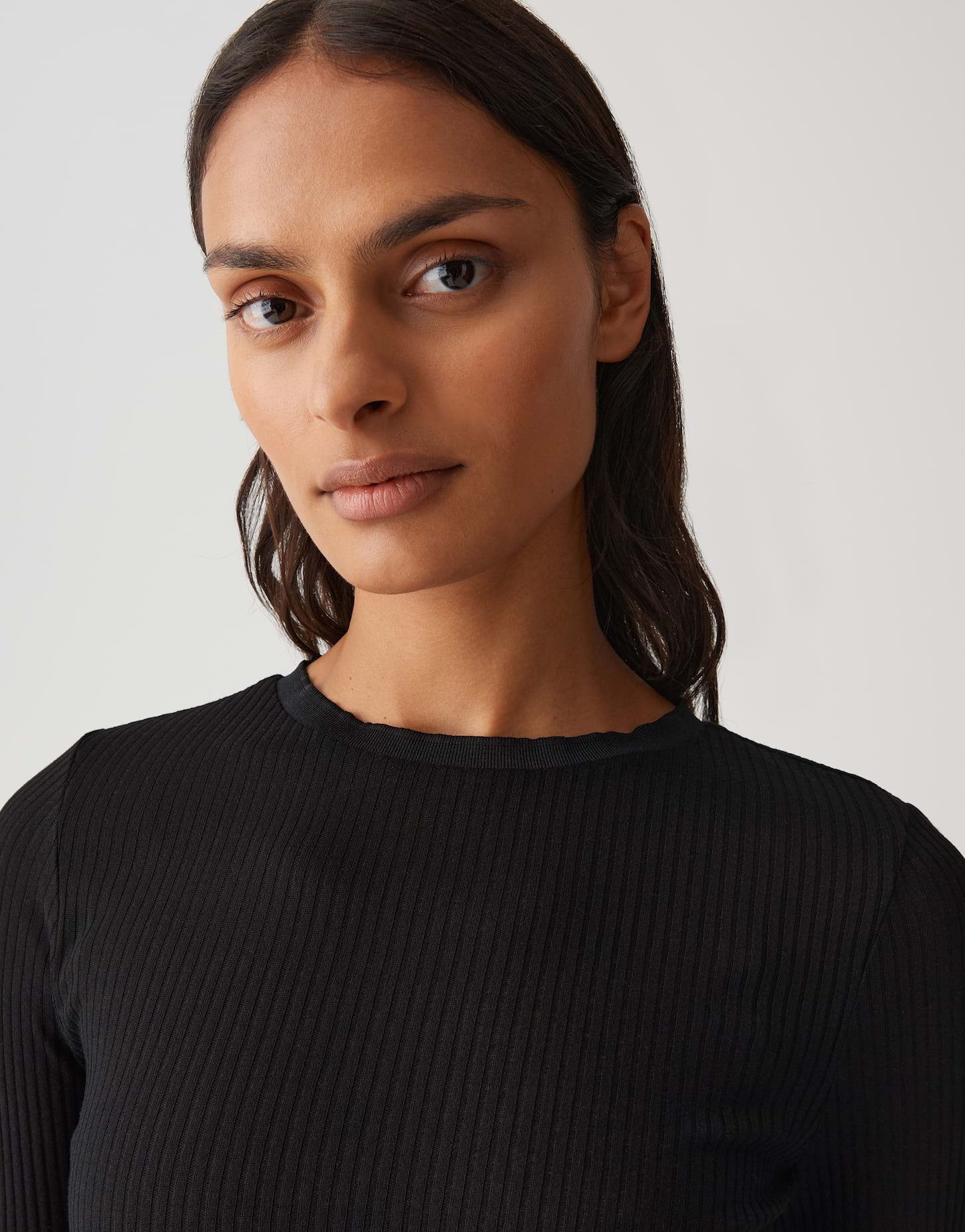 schmale Passform, figurbetont geschnitten, Langarm, hoher Rundhalsausschnitt, Rückenlänge ca. 59 cm bei Größe 36, Model Größe 178 cm – trägt Größe 36, Jersey, Rippstruktur, weicher Griff, elastischer Stoff