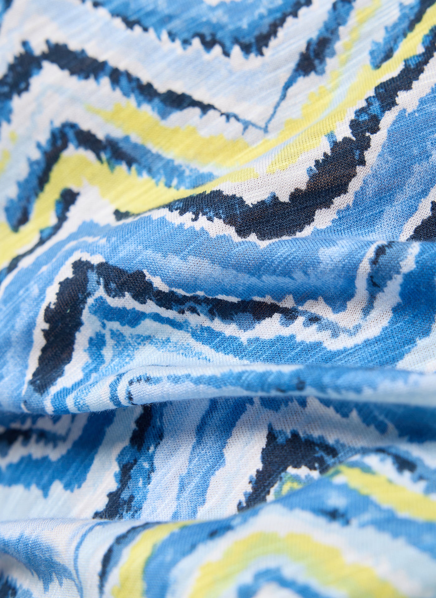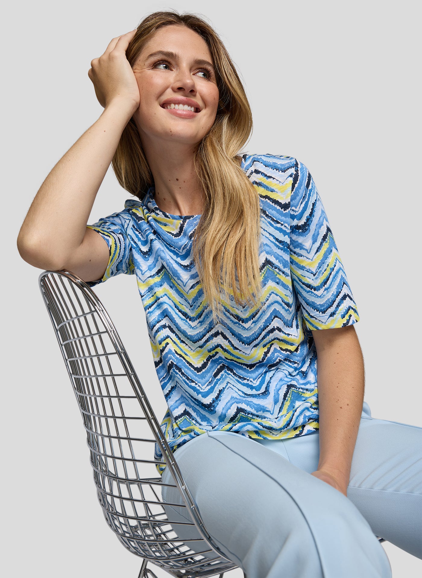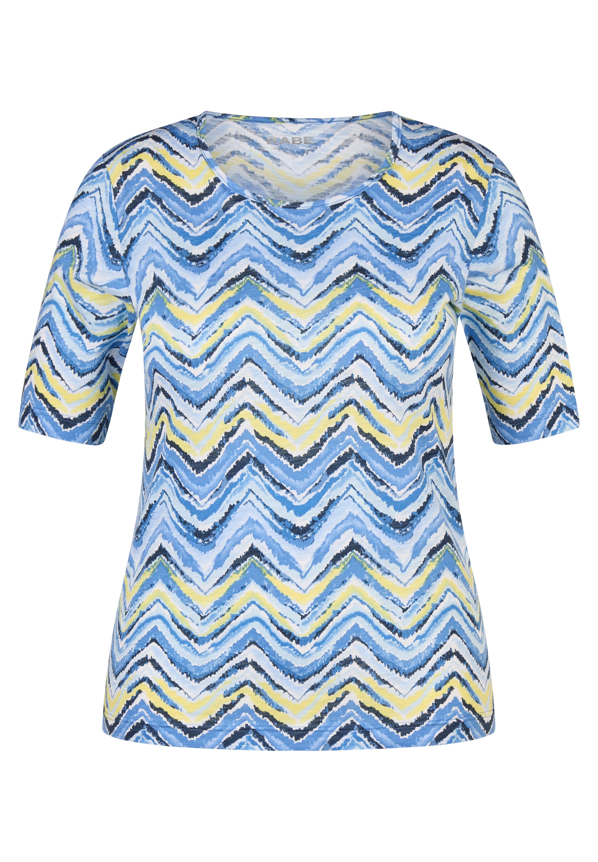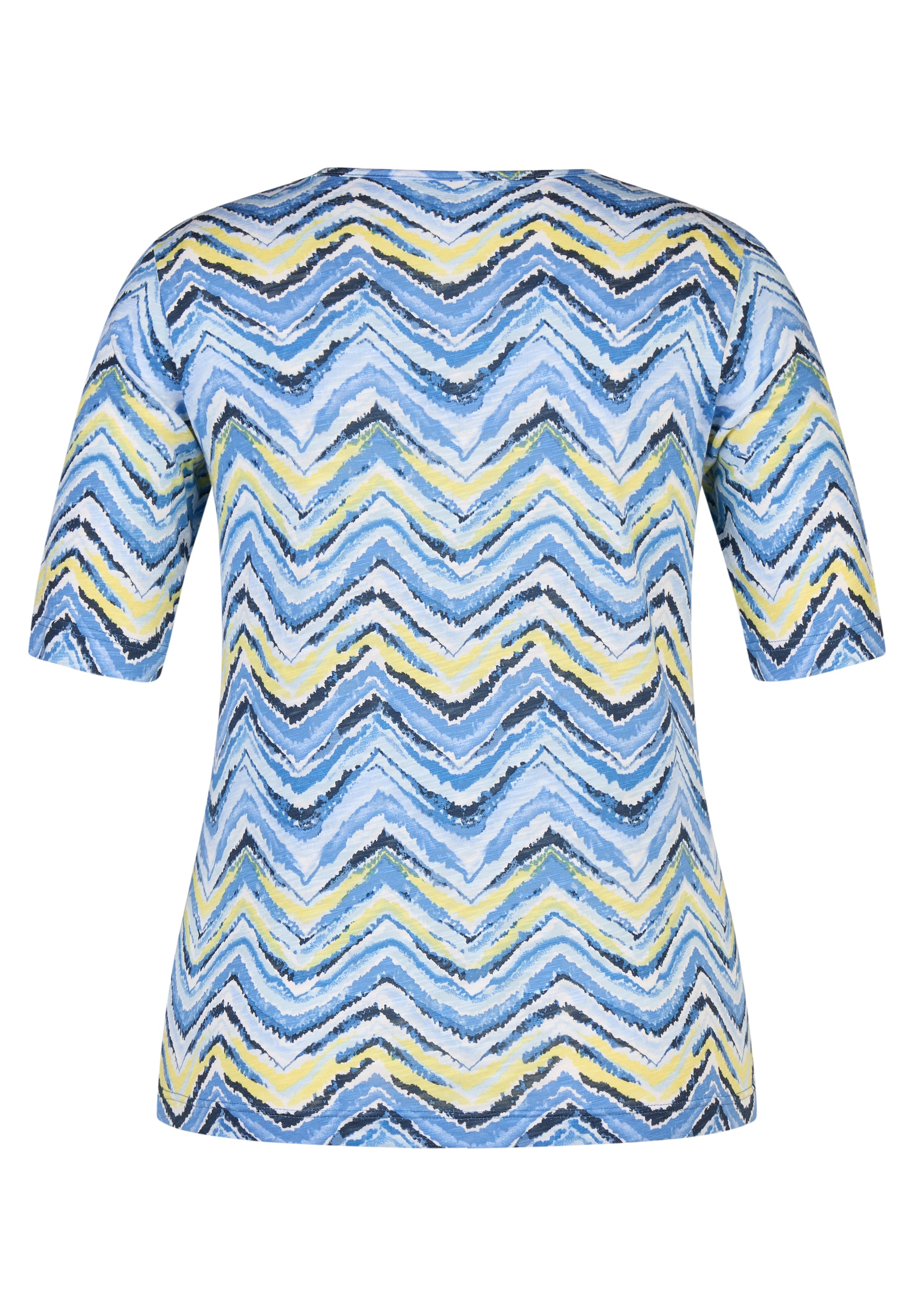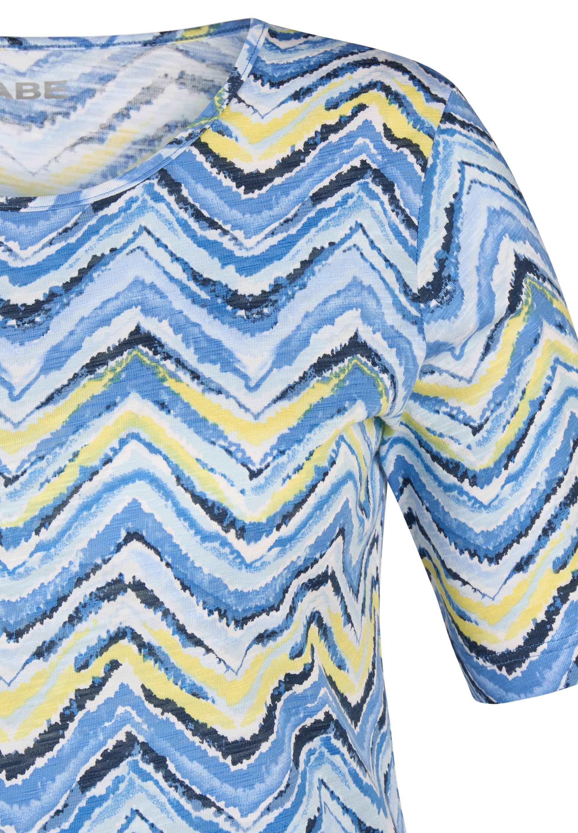 Dieses Shirt sorgt mit seinem auffälligen Zickzack-Design in frischen Farbtönen für modische Dynamik. Die bequeme Passform und der klassische Rundhalsausschnitt machen es zum idealen Begleiter für Alltag und Urlaub.Allover-Zickzack-Muster in harmonischer Farbkomposition.Rundhalsausschnitt für ein angenehmes Tragegefühl.Halblange Ärmel _ ideal für jede Jahreszeit.Weiche, elastische Jersey-Qualität.Figurfreundlicher Schnitt für bequemen, stilvollen Komfort.