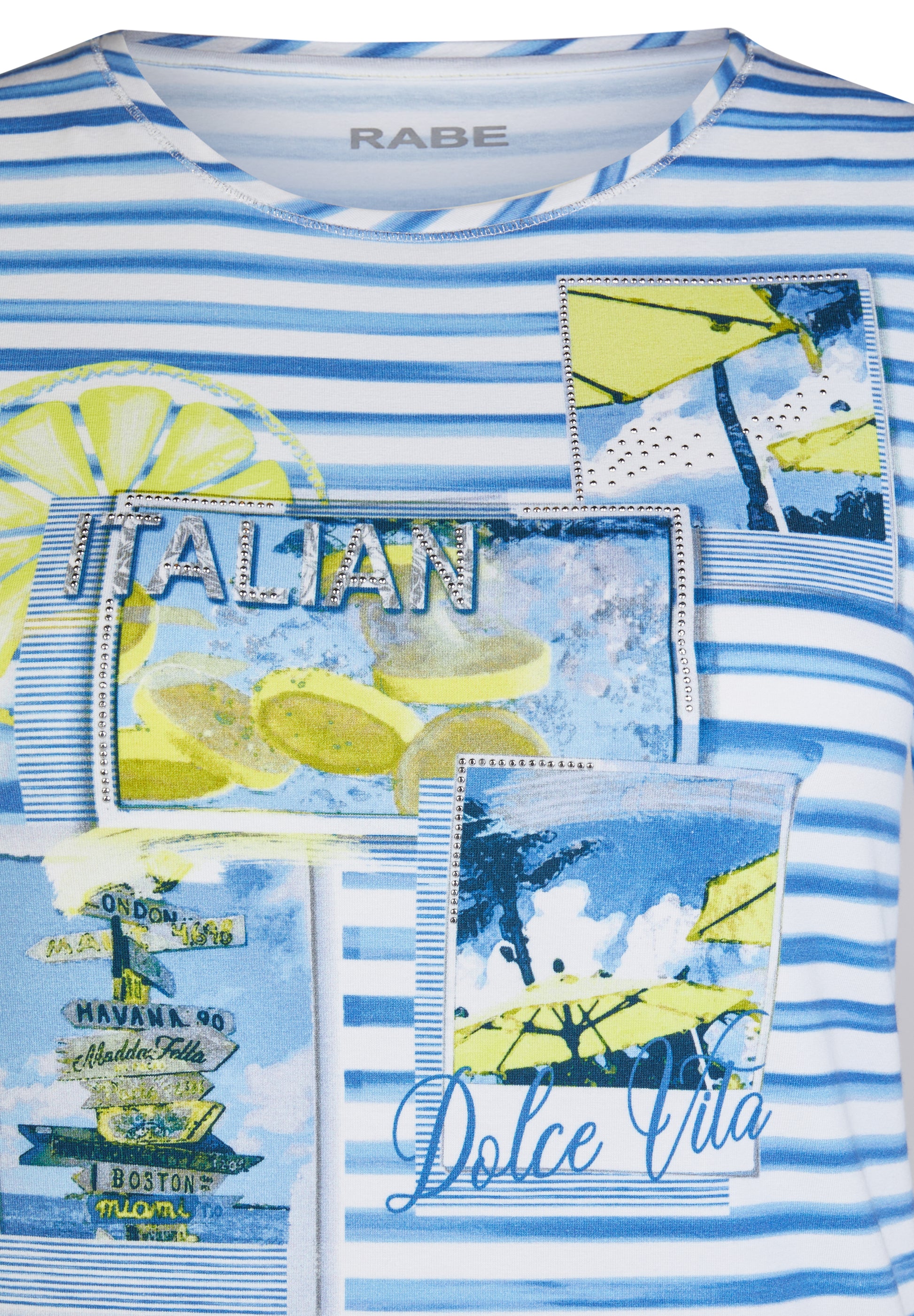 Dieses Shirt ist eine modische Hommage an das süße Leben. Die Kombination aus frischen Streifen, dekorativen Fotoprints und dem verspielten _Dolce Vita_-Schriftzug sorgt für einen lässigen, sommerlichen Look mit italienischem Charme.Allover-Streifenmuster in maritimer Optik.Mehrere Fotoprints mit Urlaubsmotiven und Zitronenakzenten.Schriftzug _Dolce Vita_ als romantisches Detail.Rundhalsausschnitt und halblange Ärmel für bequemen Sitz.Weiche Jersey-Qualität mit angenehmem Tragegefühl.