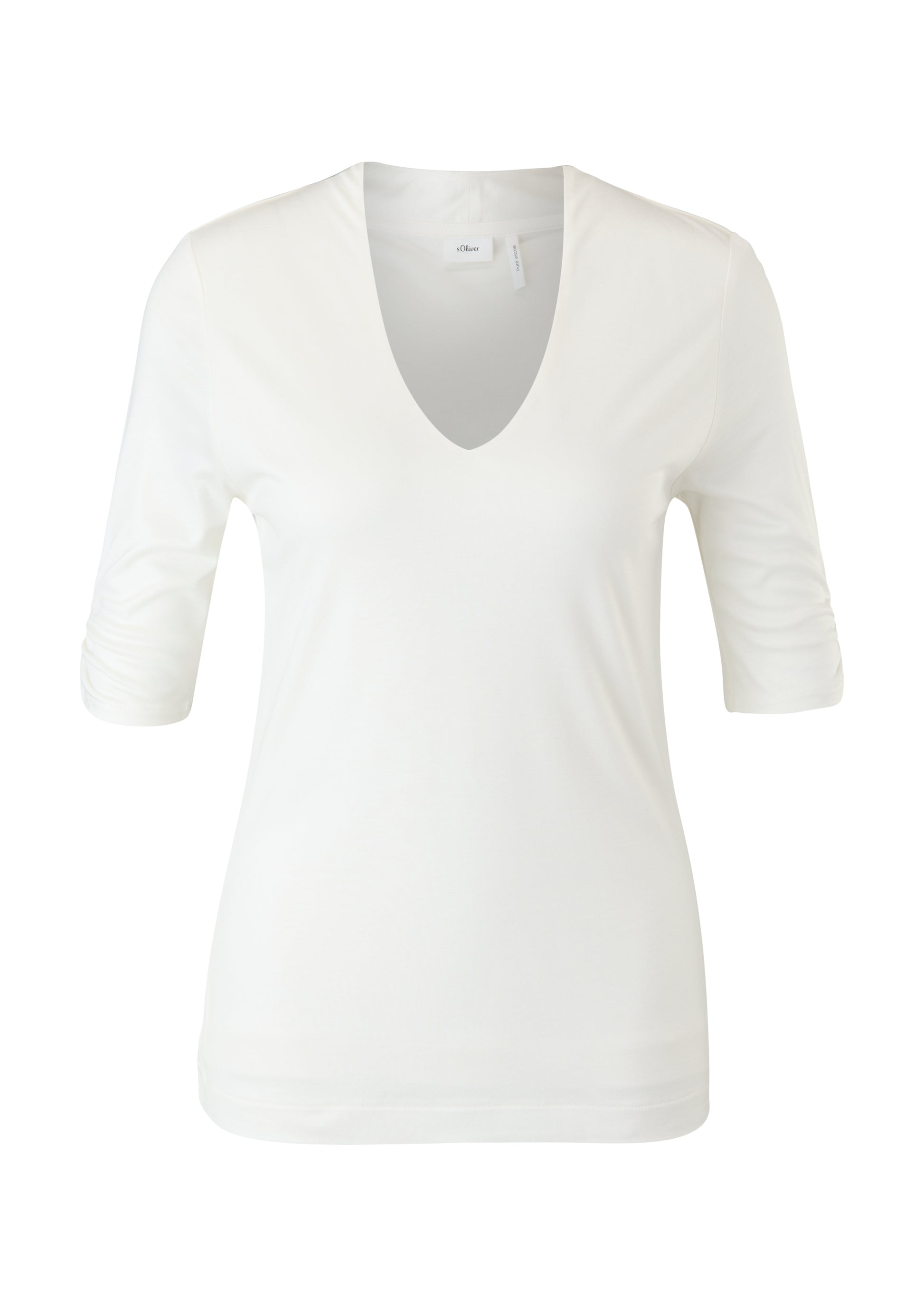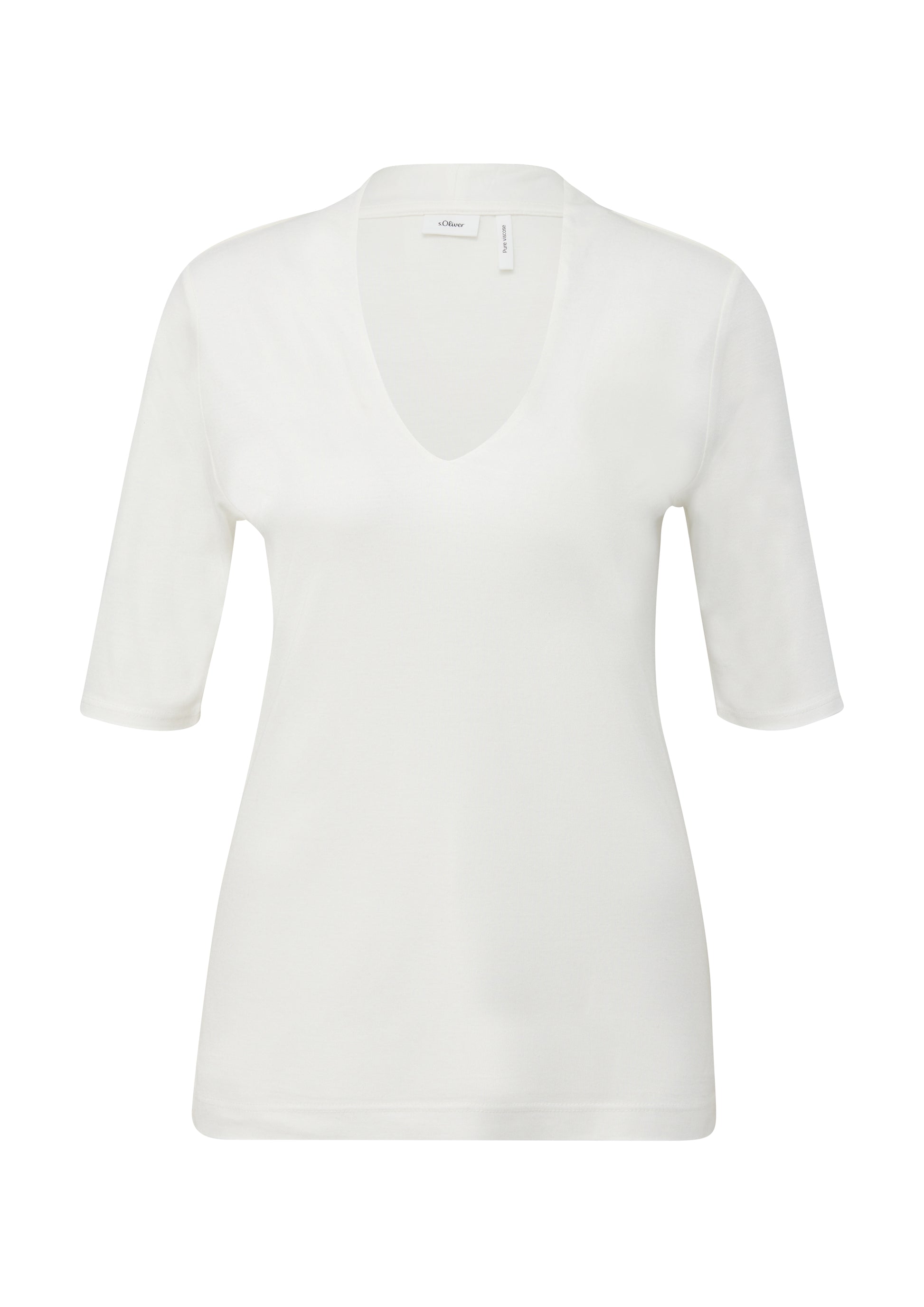Entdecke unser neues T-Shirt, das für lässige Tage entworfen wurde. Das T-Shirt aus 100% Viskose bietet ultimativen Komfort und einen femininen V-Ausschnitt. Mit seinem cleanen Look ist es vielseitig kombinierbar – perfekt für den Alltag. Der Slim Fit und halblange Ärmel betonen deine Figur, während der verlängerte Rückensaum einen trendigen Touch verleiht. Trage es zu Jeans für einen entspannten Chic oder kombiniere es mit einer Culotte für einen trendigen Look. Hol dir jetzt dein neues Lieblings-T-Shirt und sei stylisch unterwegs!