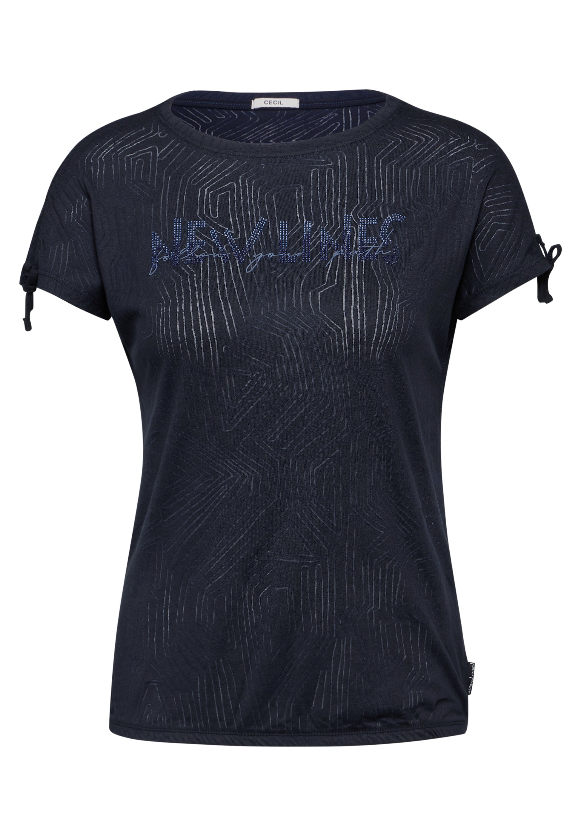 Das T-Shirt mit Burn-Out Muster von CECIL für Damen punktet mit seinem modischen Ausbrenner Muster. Das Sommershirt mit Wording verfügt über einen U-Boot-Ausschnitt und einen Gummibund. Geraffte Ärmel runden den Look ab. Sommershirt mit Wording U-Boot Ausschnitt Gummibund Geraffte Ärmel Ausbrenner Muster Material: 50% Baumwolle, 50% Polyester