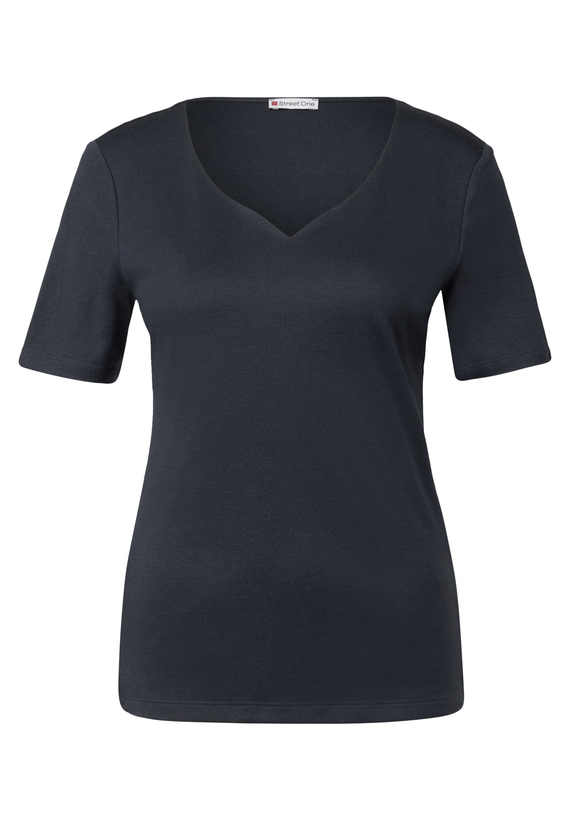 Das T-Shirt von Street One für Damen begeistert mit einem modernen Herzausschnitt und weichem Baumwoll-Modalmix. Die doppellagige Front sorgt für blickdichte Qualität und ein angenehmes Tragegefühl. Ein stilvoller Allrounder, der sich perfekt in deinen Alltagslook einfügt. Kurzarmshirt Herzausschnitt Doppellagige Front für blickdichte Qualität Vielseitiger Allrounder Softer Baumwoll-Modalmix Material: 50% Baumwolle, 50% Modal