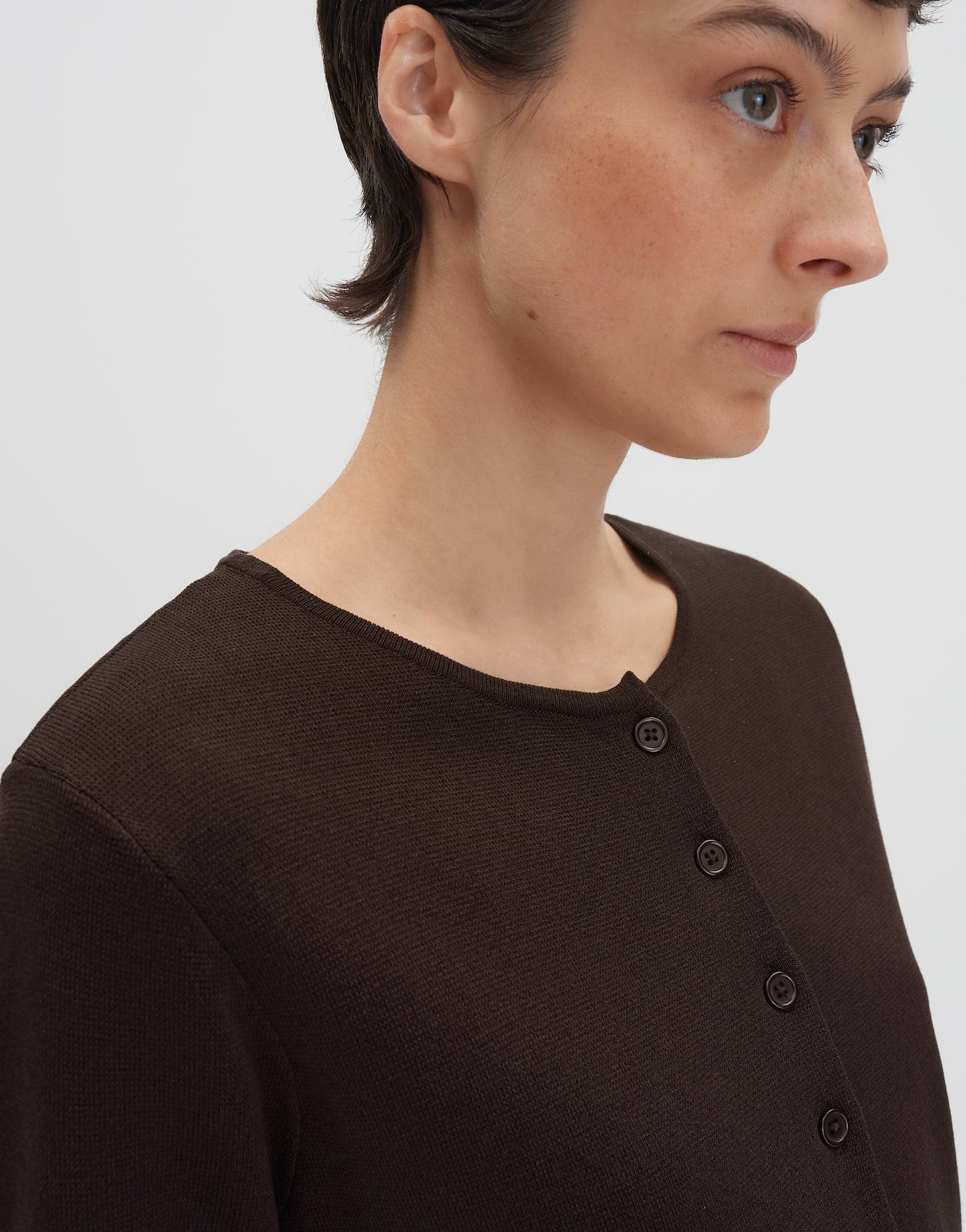 figurbetonte Passform, gerader Schnitt, Halbarm, hoher Rundhalsausschnitt, Rückenlänge ca. 55 cm bei Größe 36, Model Größe 178 cm – trägt Größe 36, Feinstrick, natürlicher Griff, formstabil, breiter Ripp-Saum, Knopfleiste vorn