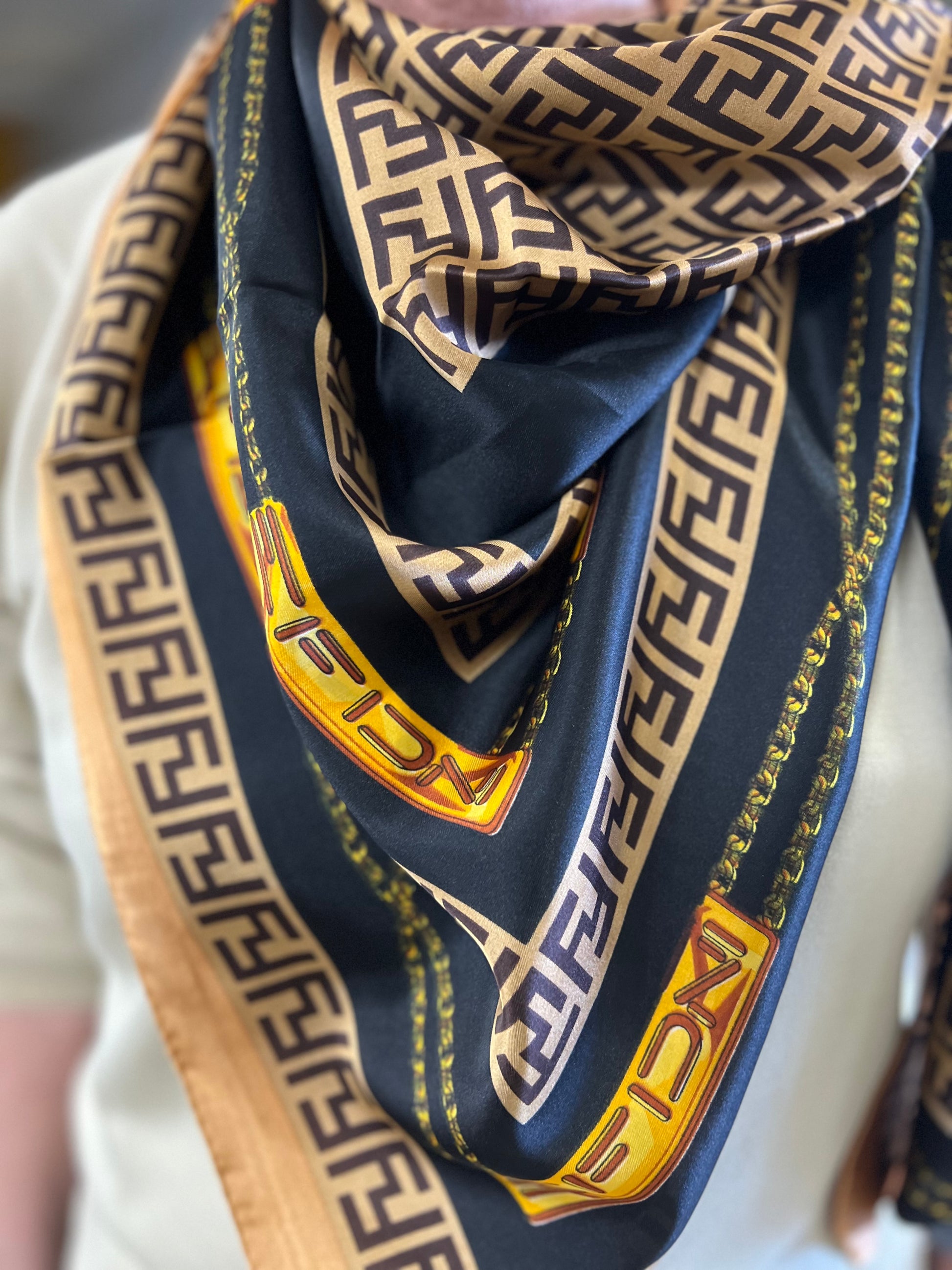 Dieses luxuriöse Tuch in kräftigem Orange, gold oder taupe ist ein echtes Statement-Piece. Das seidig-glänzende Material verleiht dem Accessoire eine hochwertige Haptik, während das auffällige Kettendruck-Design in Kombination mit grafischem Muster für einen modernen, eleganten Look sorgt. Die harmonische Farbkombinationmacht das Tuch zum perfekten Eyecatcher – ob klassisch um den Hals getragen, als Haarband gestylt oder als Hingucker an der Tasche. Ein vielseitiges Accessoire für modebewusste Looks.