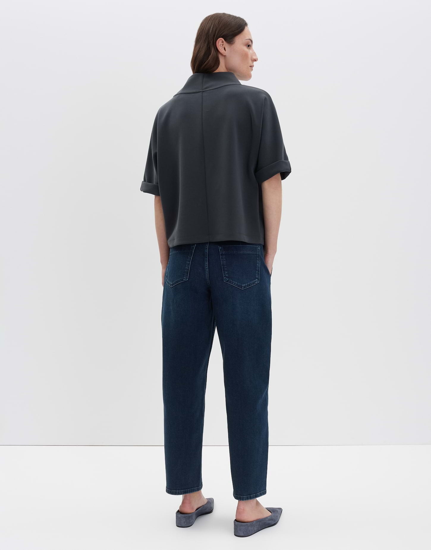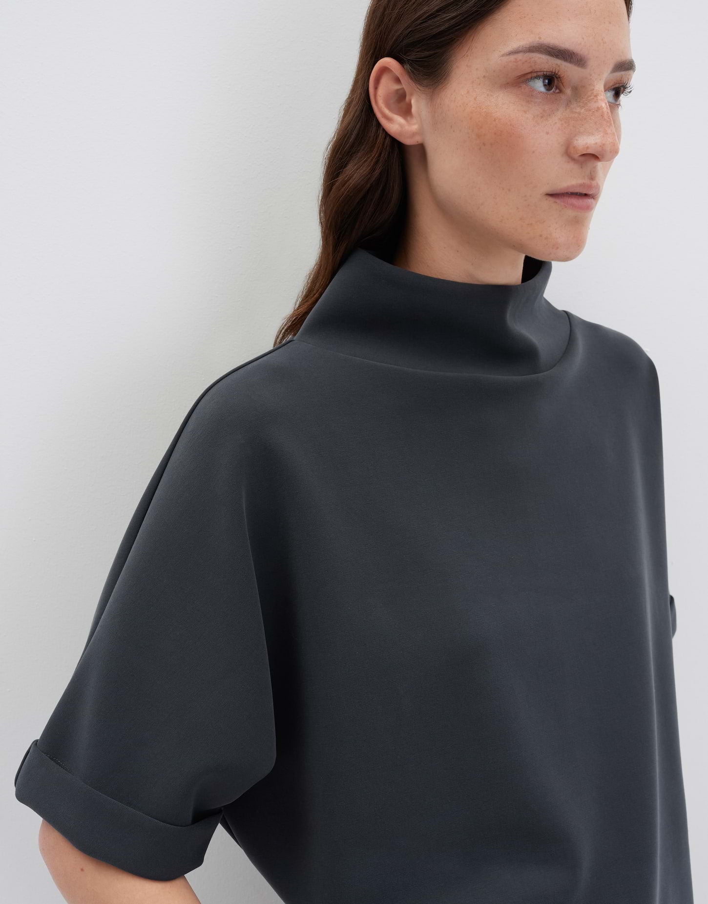 weite Passform, Boxy Silhouette, überschnittener Halbarm, Stehkragen, Rückenlänge ca. 55 cm bei Größe S, Model Größe 177 cm – trägt Größe S, Sweatware, extrem weicher Griff, samtige Oberfläche, matter Glanz in der Oberfläche, Aufschlag am Ärmel
