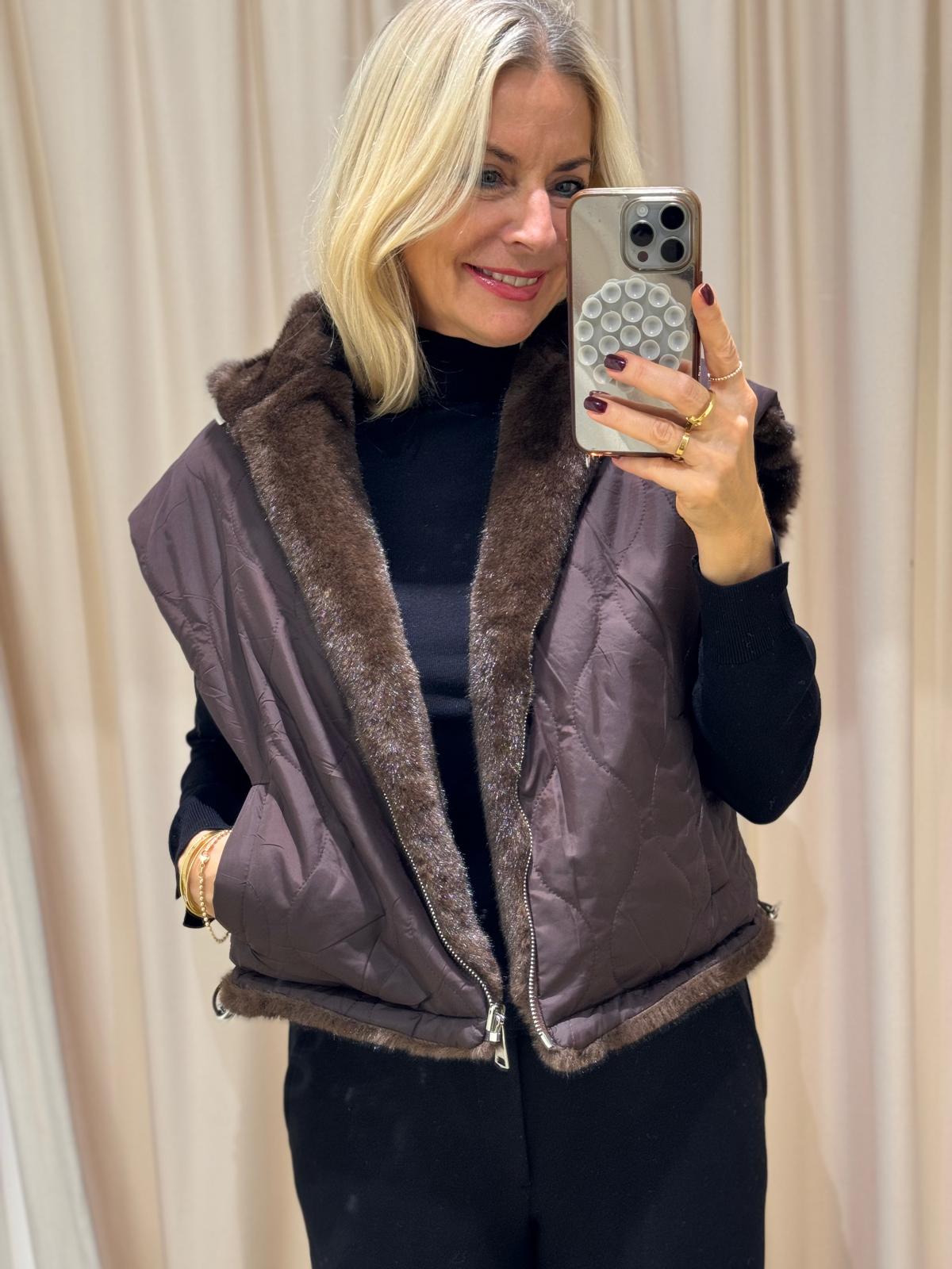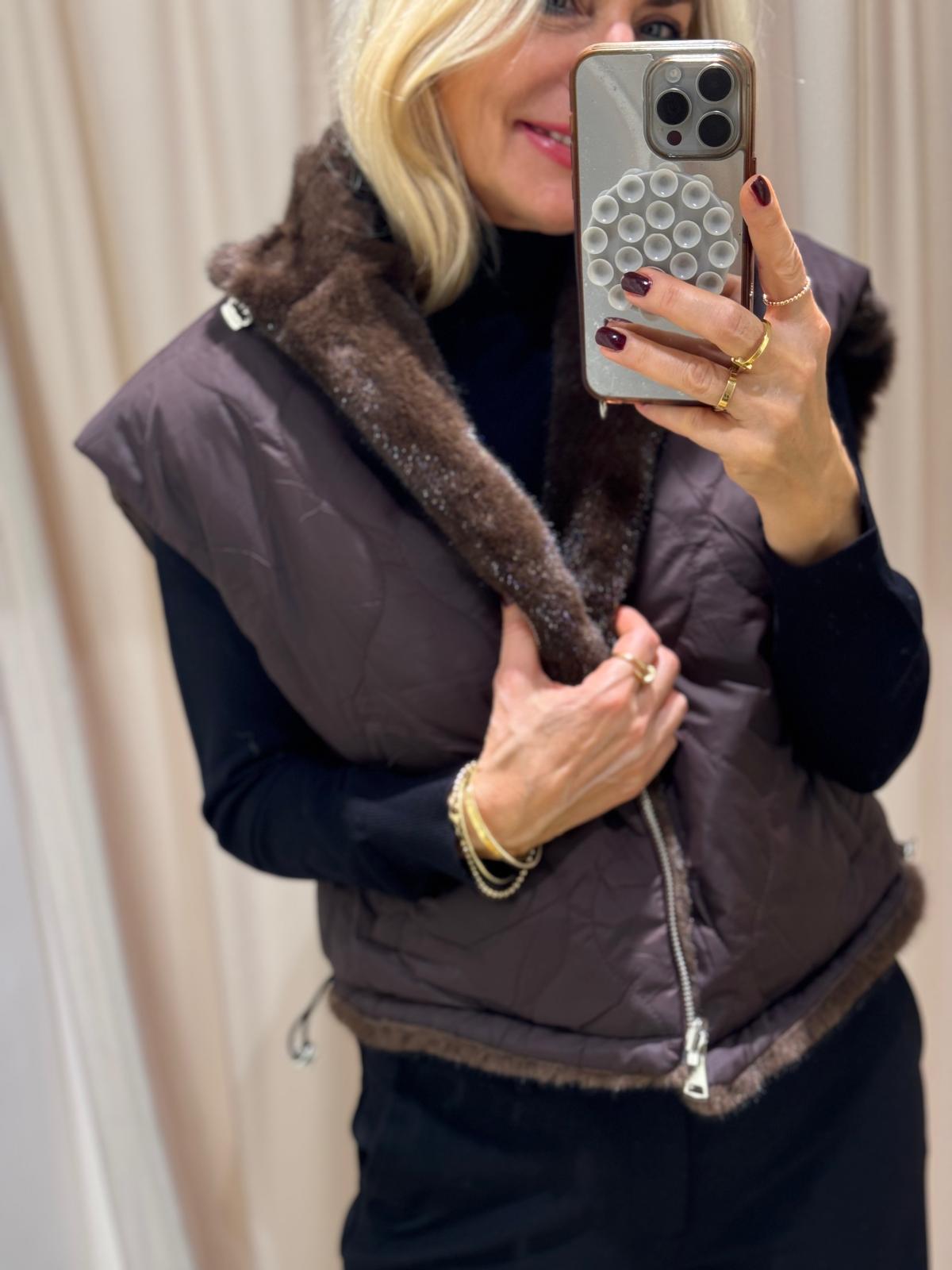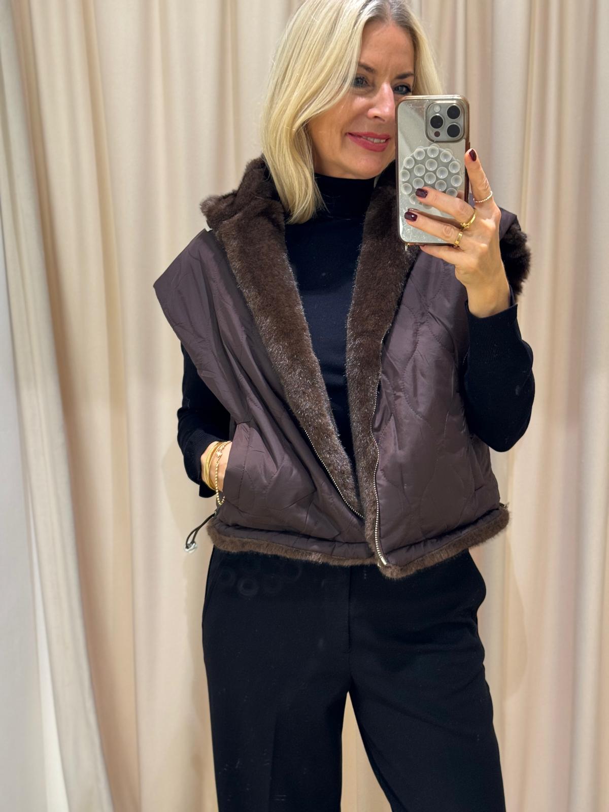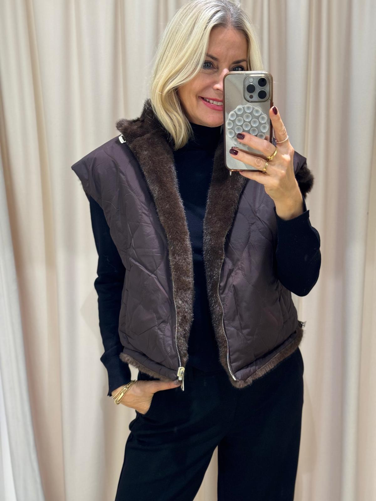 Unsere Wende-Weste „Pelu“ kombiniert luxuriösen Webpelz auf der einen Seite mit einer cleanen, gesteppten Oberfläche auf der anderen.