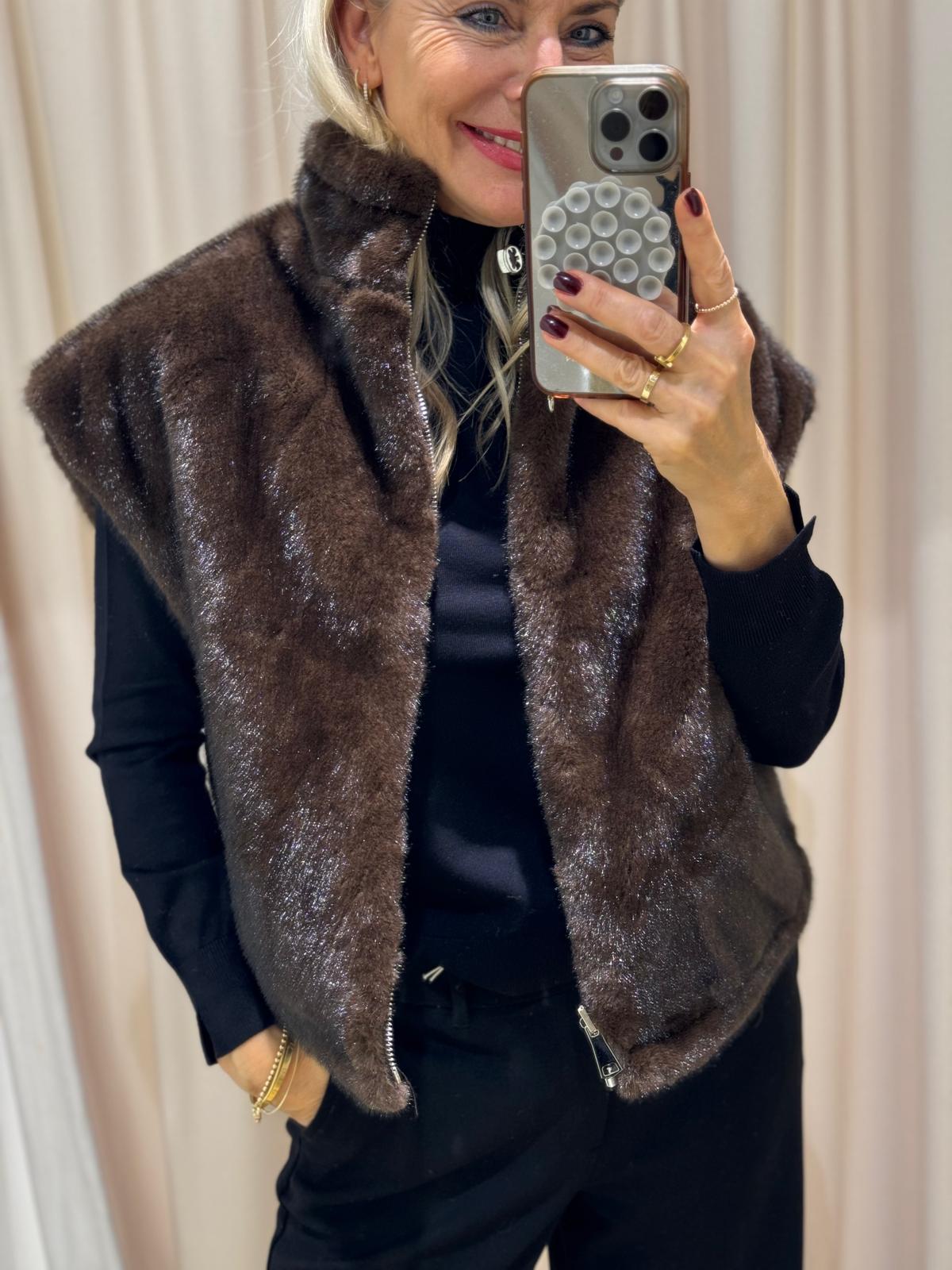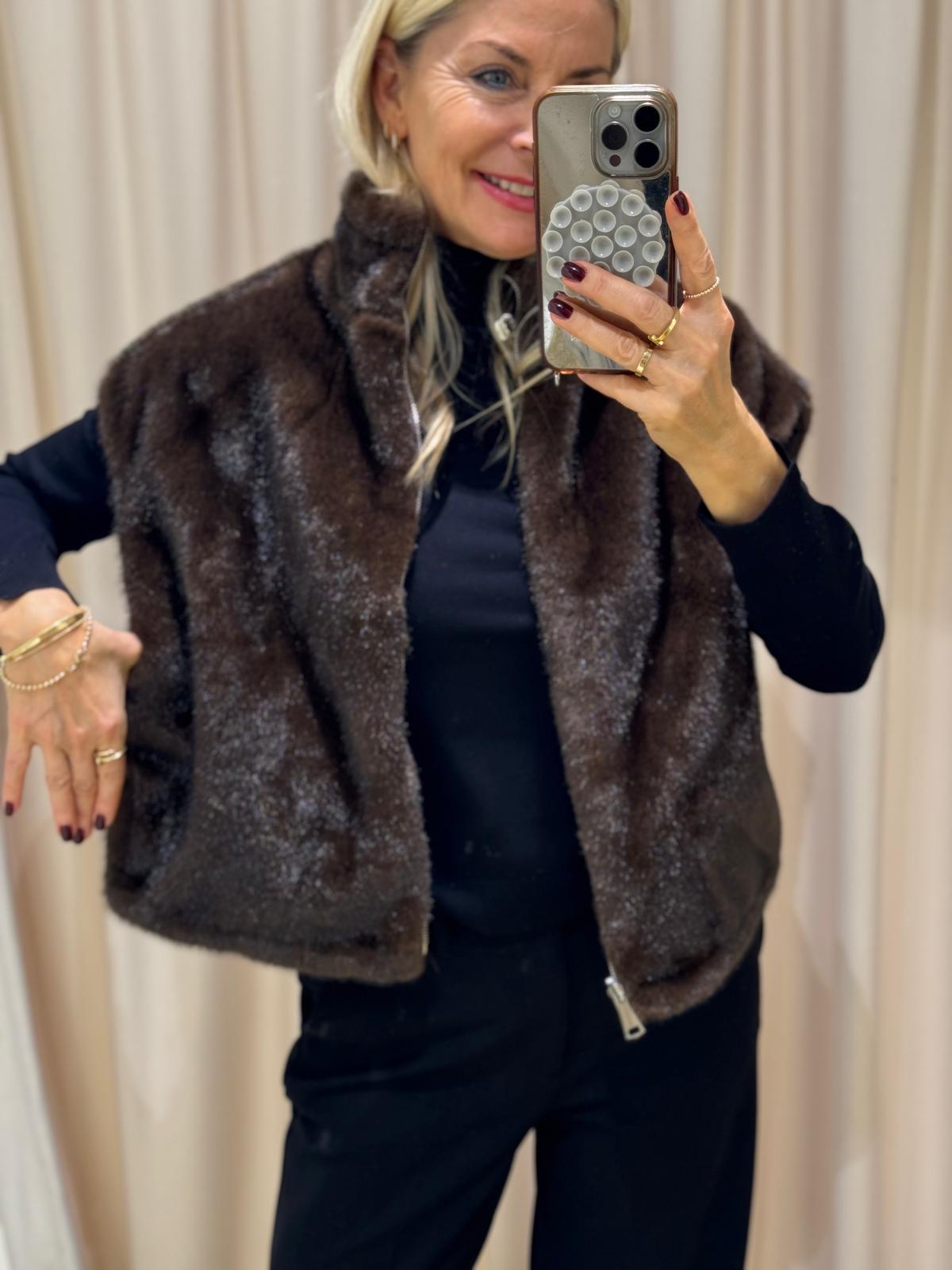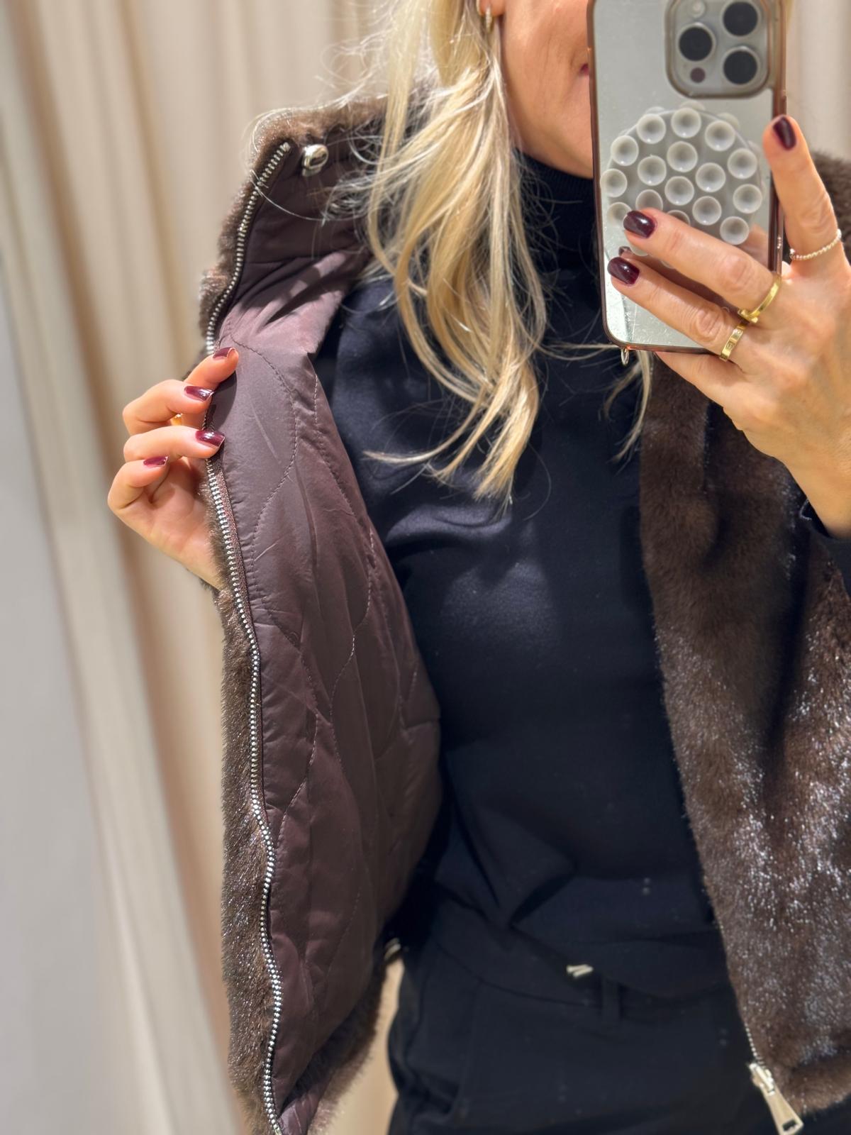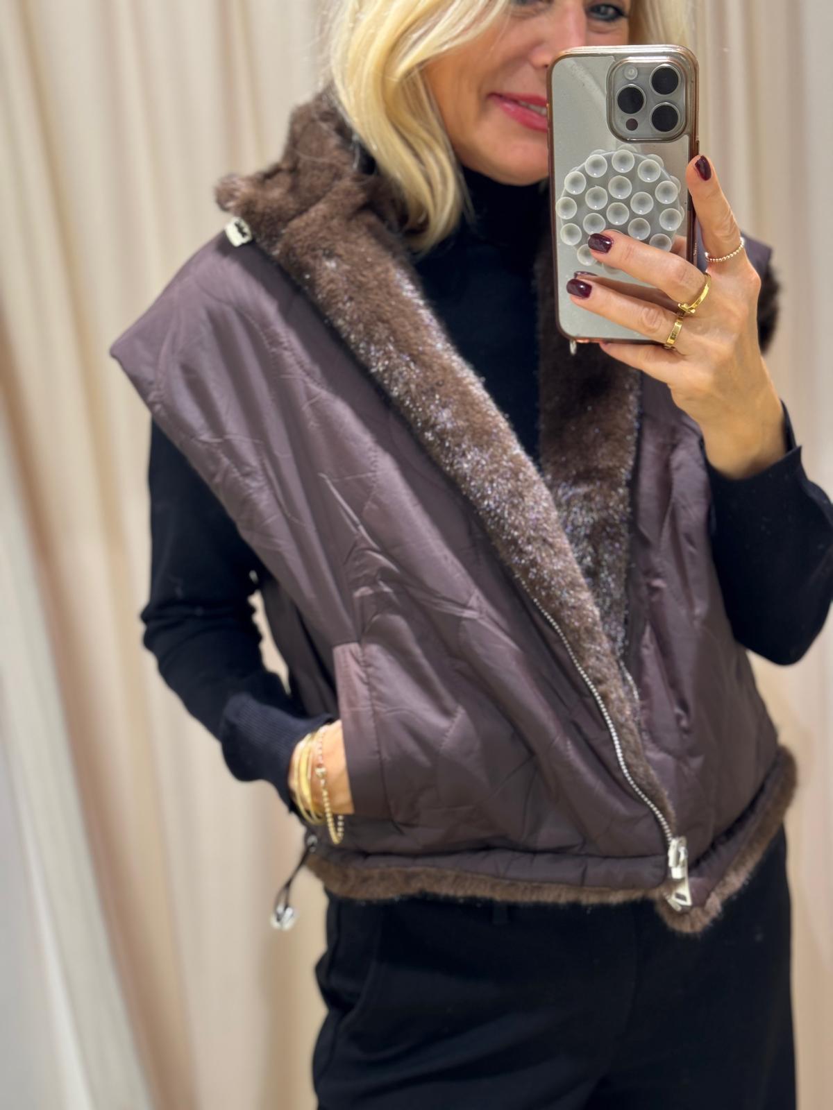 Unsere Wende-Weste „Pelu“ kombiniert luxuriösen Webpelz auf der einen Seite mit einer cleanen, gesteppten Oberfläche auf der anderen.