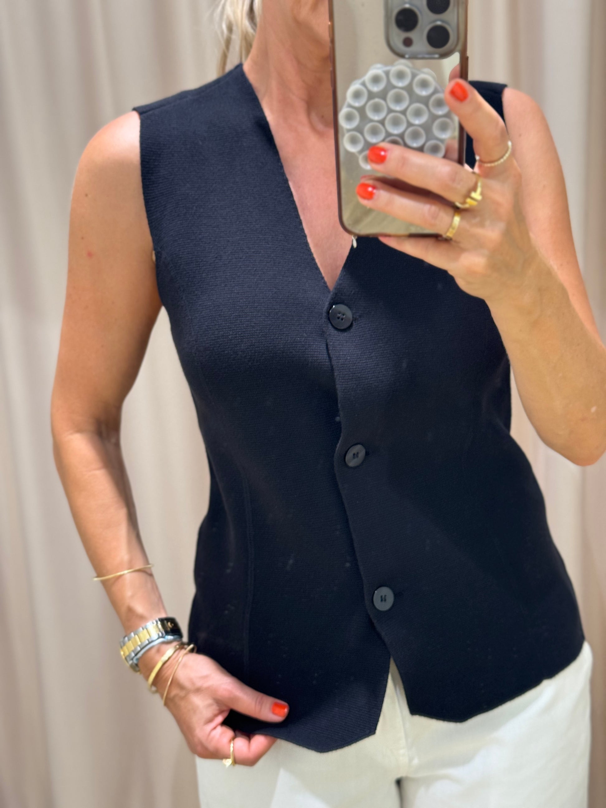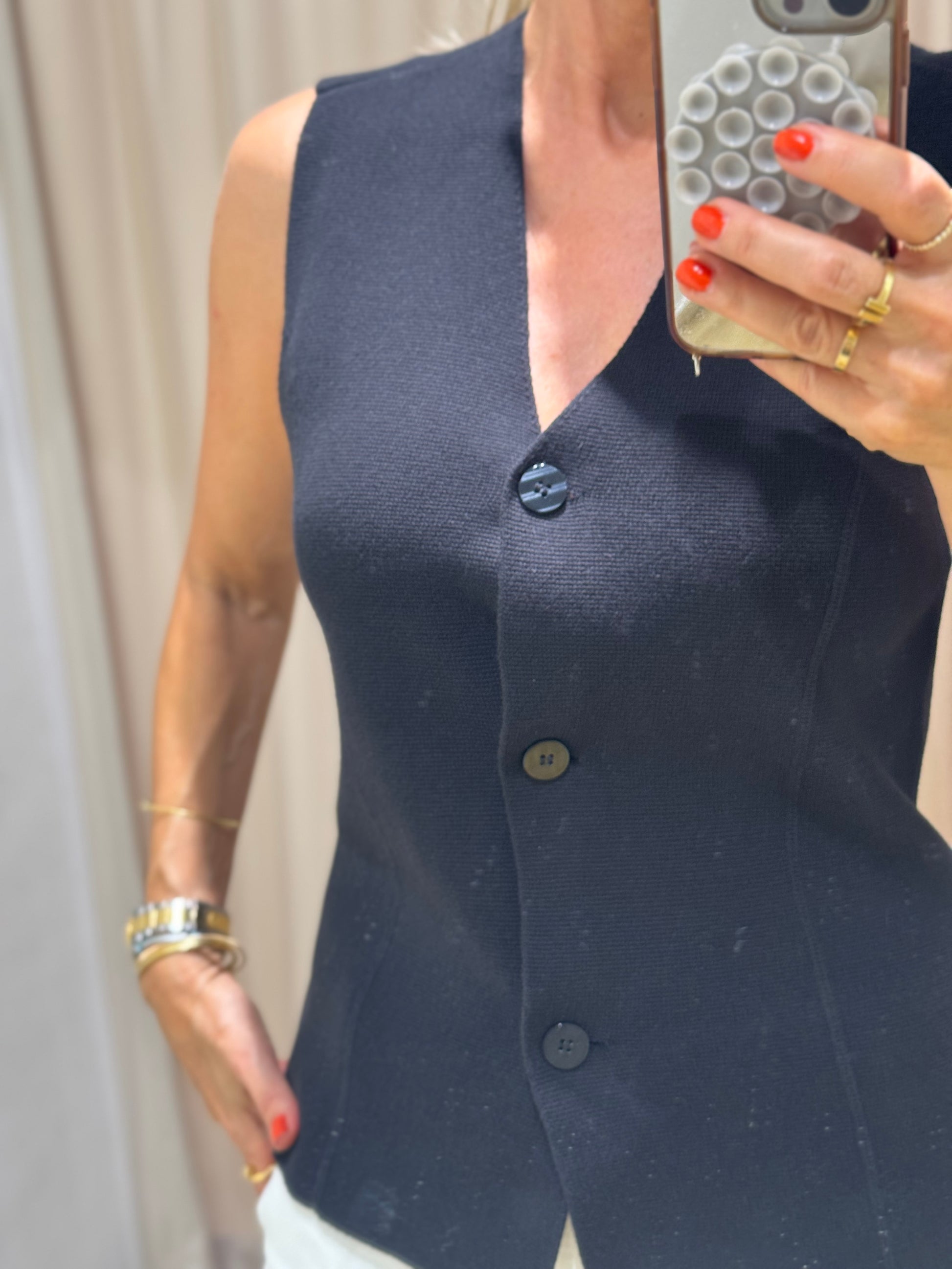 Ein Teil, das sofort klasse ausstrahlt - Unsere Giletweste ist zeitlos, clean und unglaublich vielseitig. Der Figurentheater Schnitt zaubert eine schöne Silhouette, während der hochwertige Baumwollstrick für Tragekomfor sorgt. Ob pur zu einer weißen Hose oder als Layering-Piece über eine Bluse oder Kleid - dieses Piece funktioniert das ganze Jahr über.