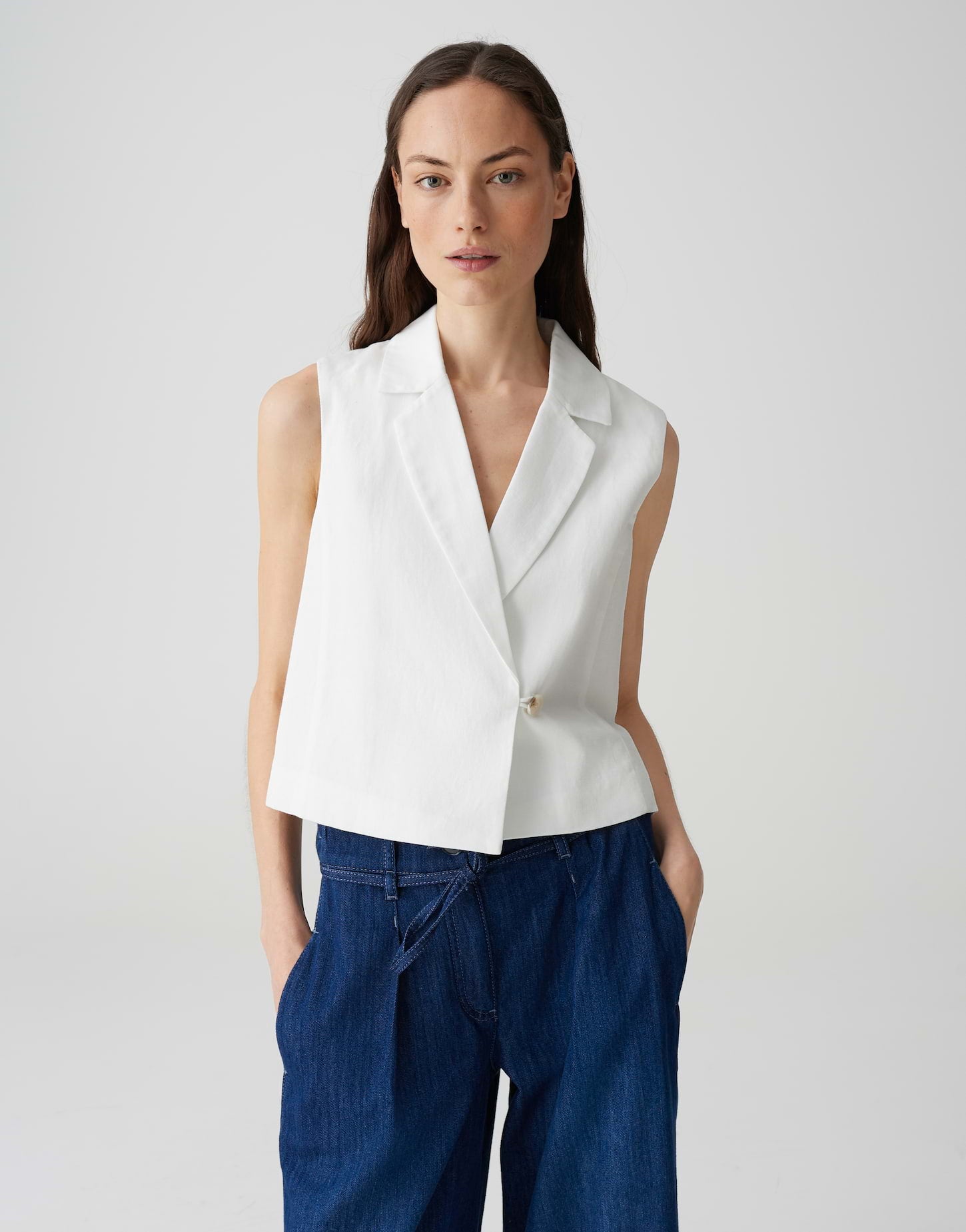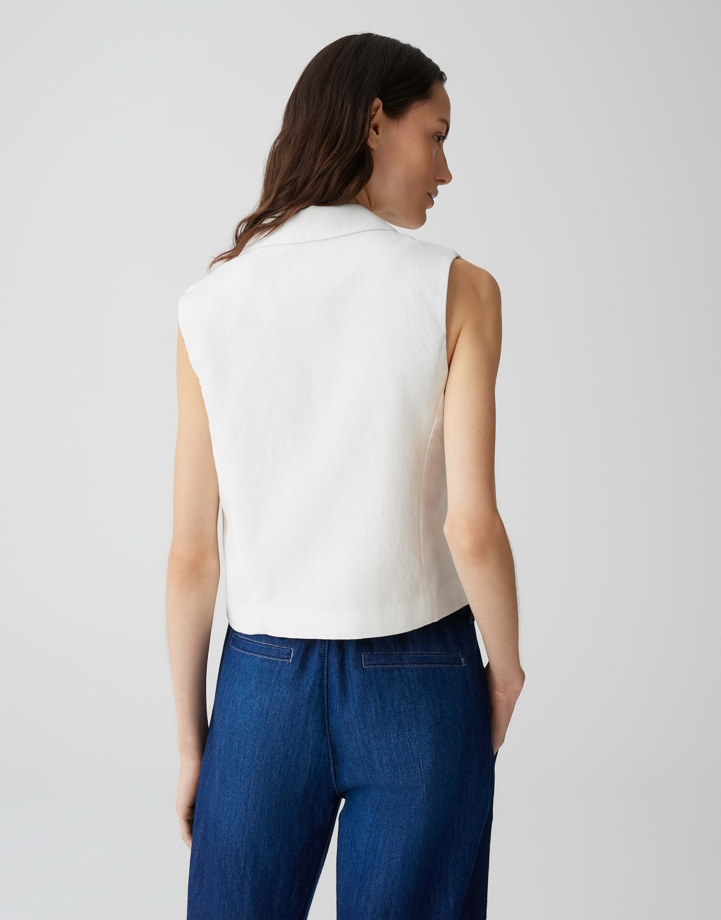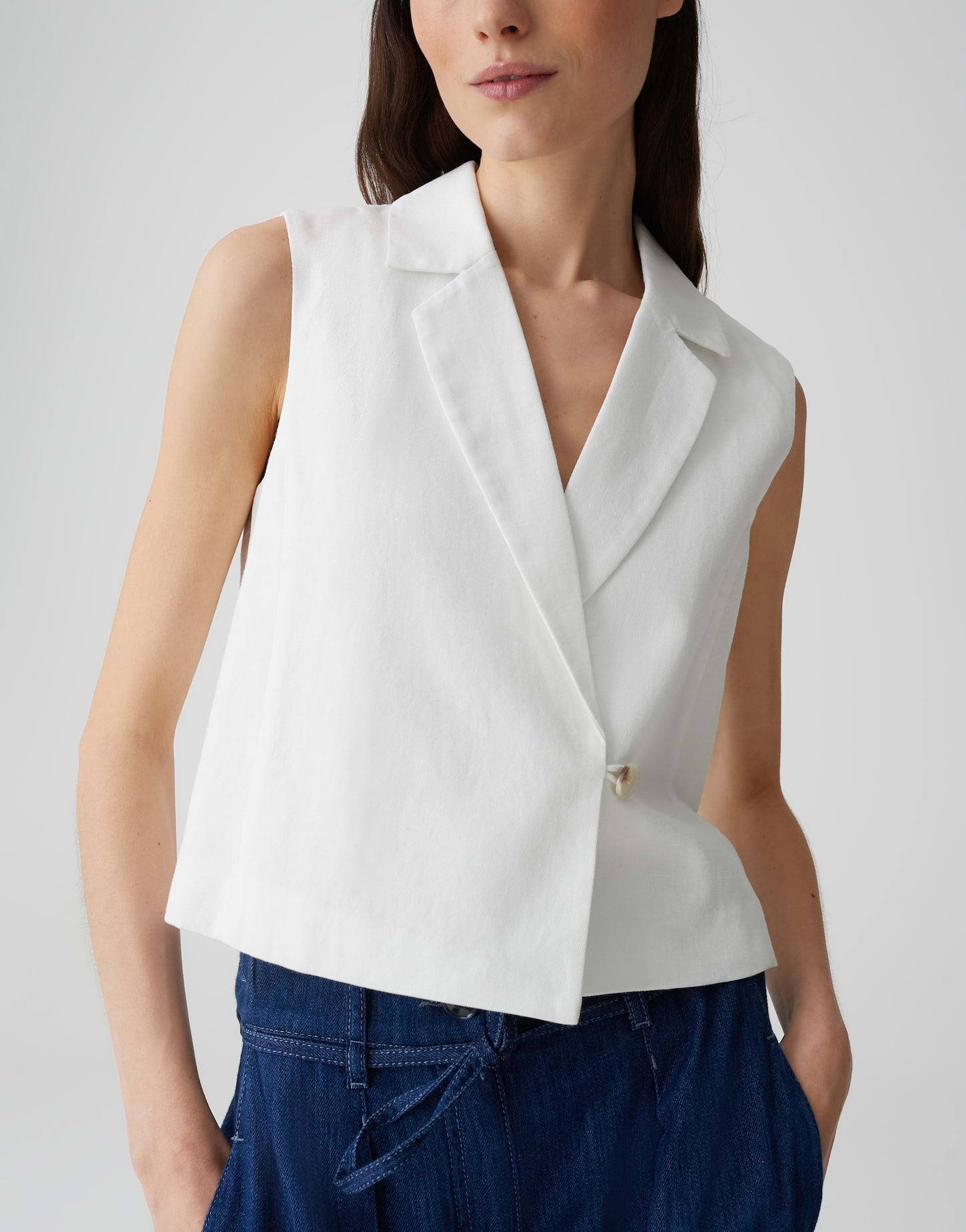 normale Passform, gerader Schnitt, kurz geschnitten, ärmellos, Reverskragen, Rückenlänge ca. 49,5 cm bei Größe 36, Model Größe 177 cm – trägt Größe 36, glattes Innenfutter, Webware, Twill, dezente Struktur, natürlicher Griff, Ein-Knopf-Verschluss