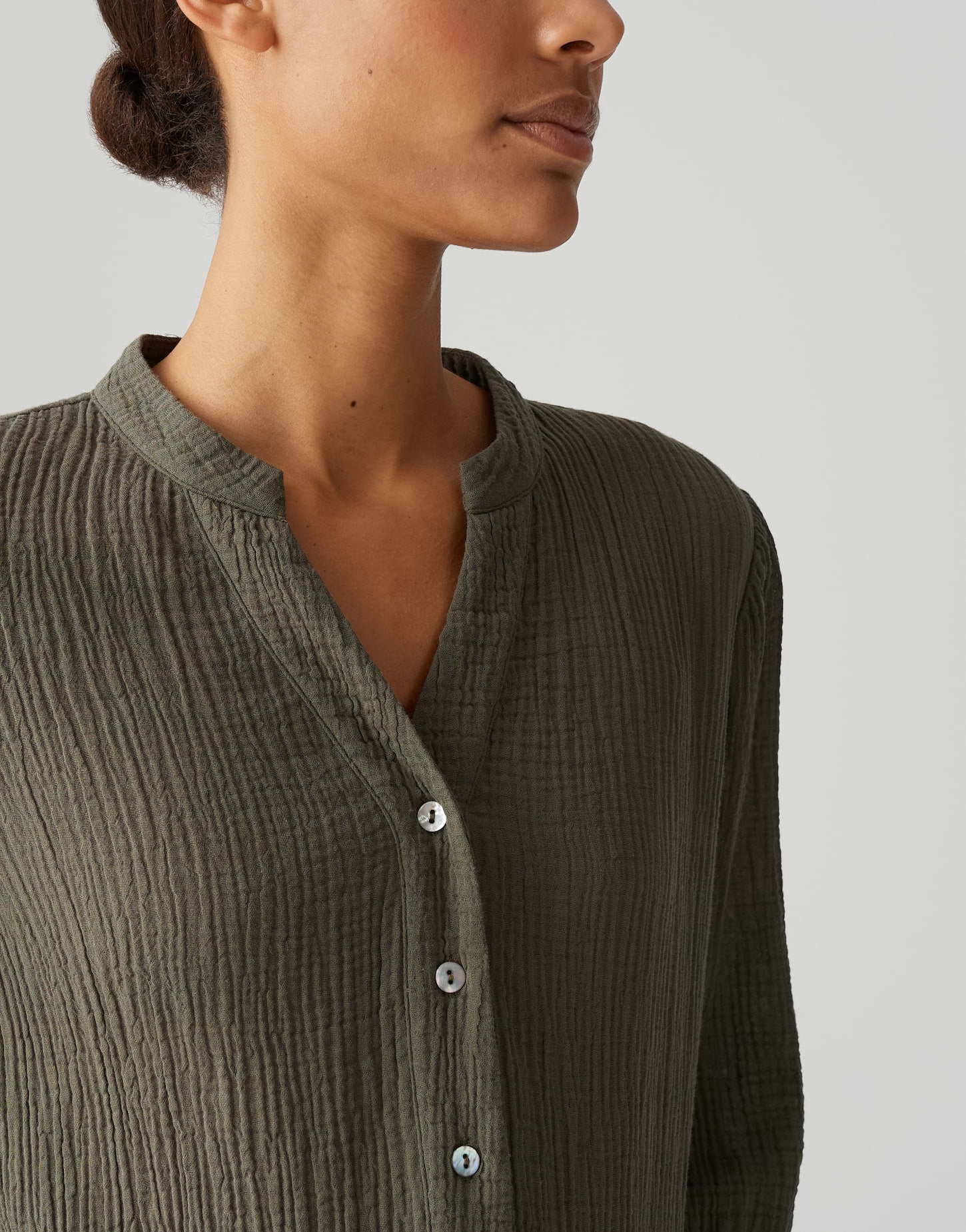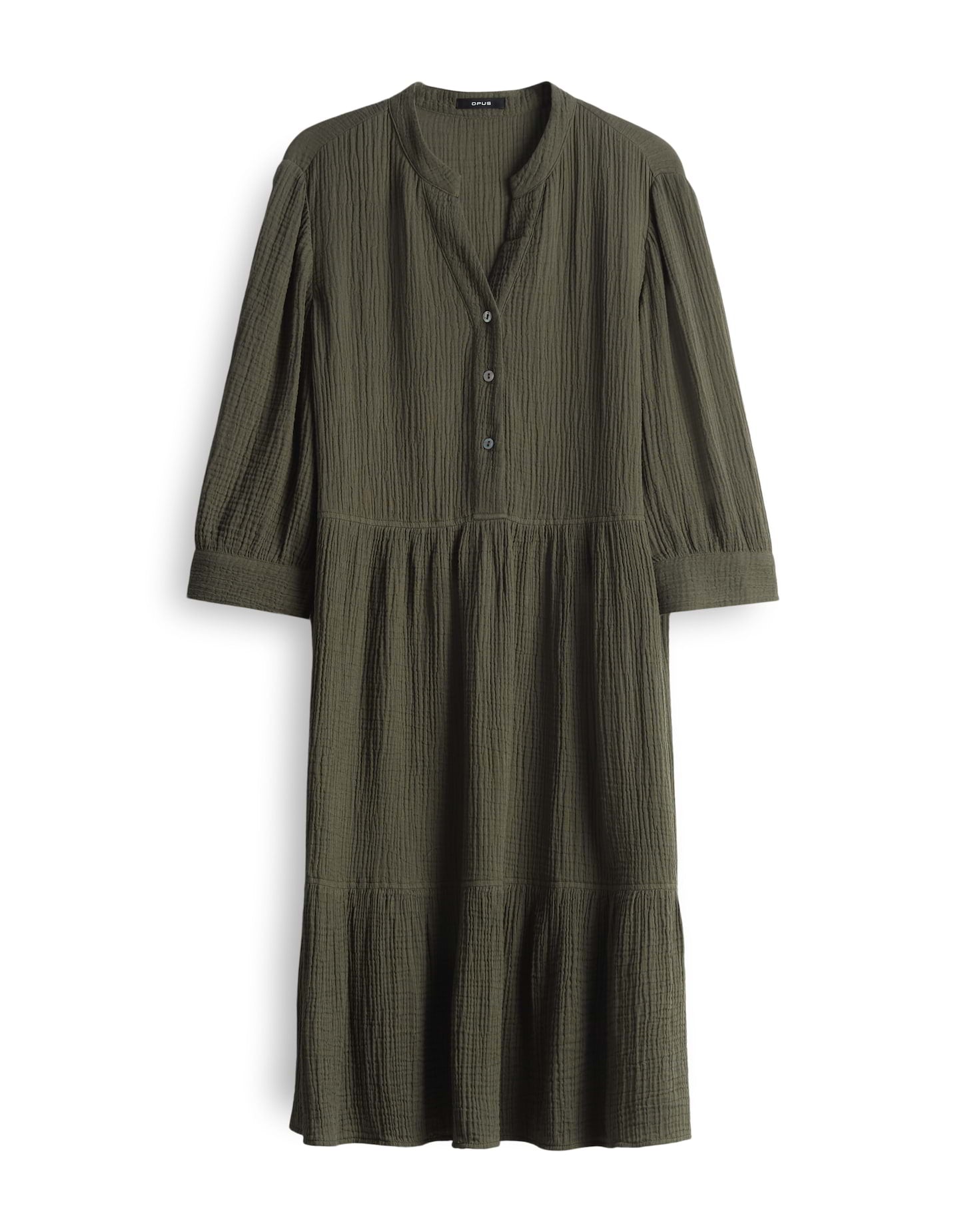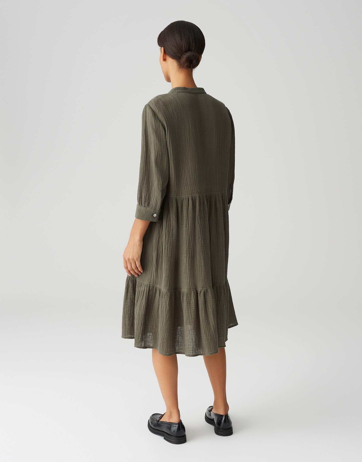lockere Passform, ausgestellt geschnitten, endet vor dem Knie, 3/4 Arm, Rundhals mit V-Auschnitt, Rückenlänge ca. 100 cm bei Größe 36, Model Größe 175 cm – trägt Größe 36, Webware, enthält nichttextile Teile tierischen Ursprungs, 3-dimensionale Struktur, weicher Griff, weich fließender Fall, kurze Knopfleiste, Perlmuttknöpfe, Ballonärmel, Volant mit Kräuselung