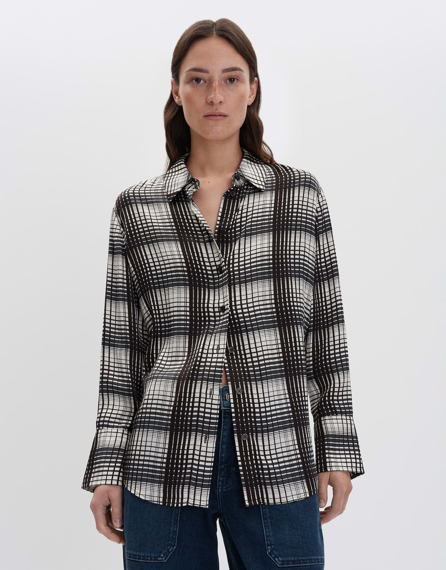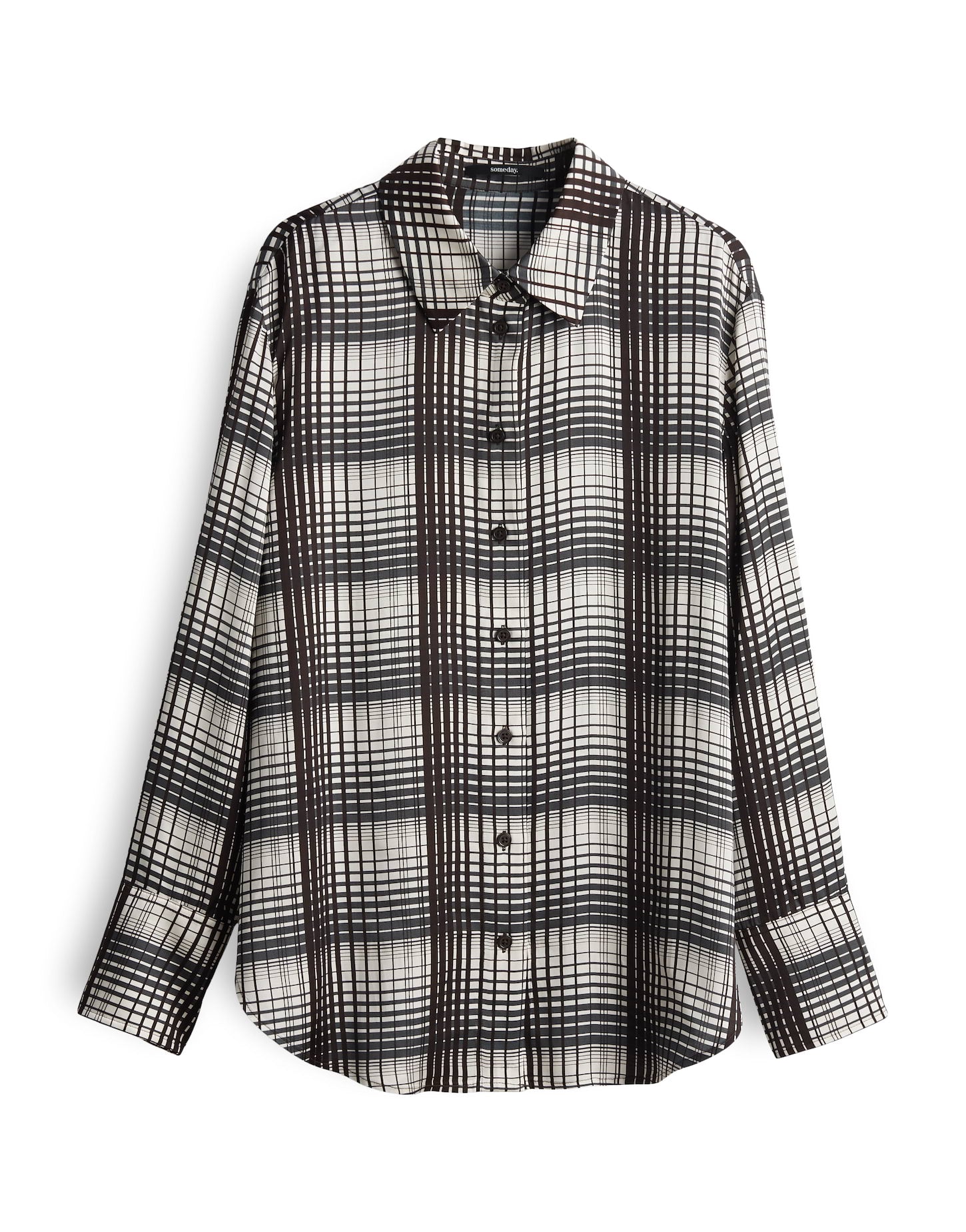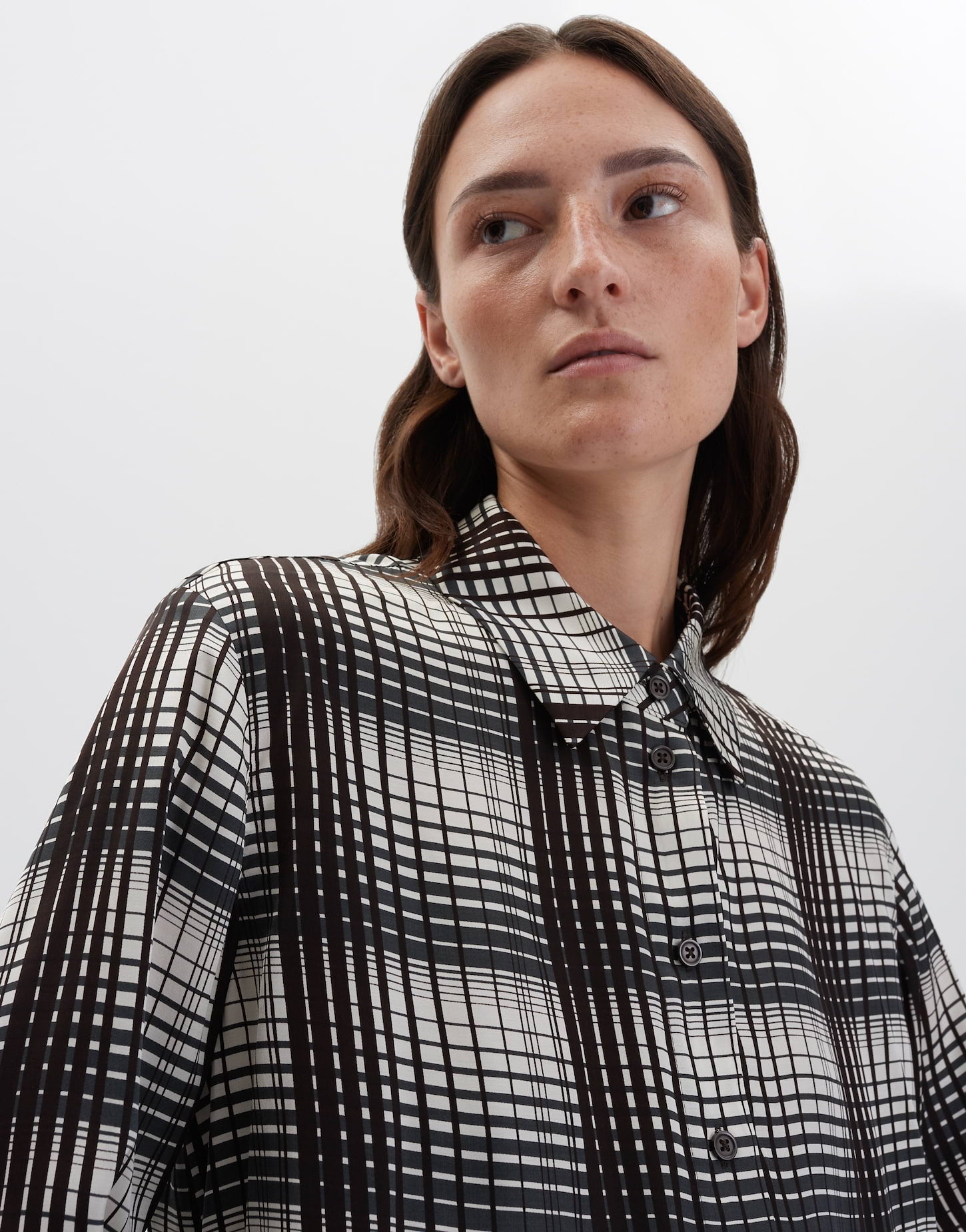 lockere Passform, gerader Schnitt, Long, Langarm, Hemdblusenkragen, Rückenlänge ca. 73 cm bei Größe 36, Model Größe 177 cm – trägt Größe 36, Webware, glatter Griff, schimmernde Oberfläche, Karomuster, abgerundeter Saum, Knopfleiste