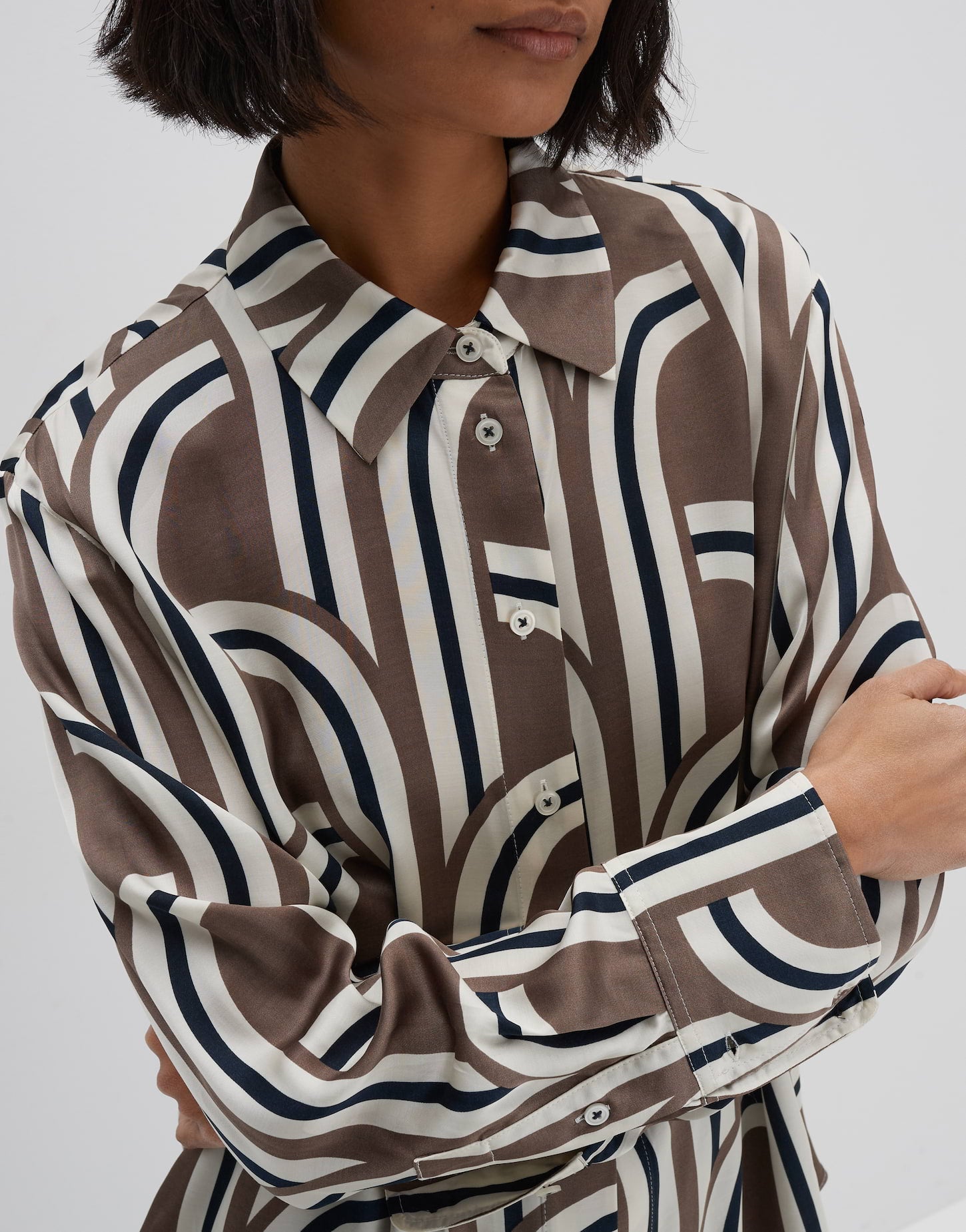 lockere Passform, gerader Schnitt, Langarm, Hemdblusenkragen, Rückenlänge ca. 73 cm in Größe 36, Model Größe 176 cm – trägt Größe 36, Webware, kühler Griff, fließender Fall, Retro Print, Falte im Rücken, abgerundeter Saum, Knopfleiste vorn, klassische Manschetten, Passe im Rücken