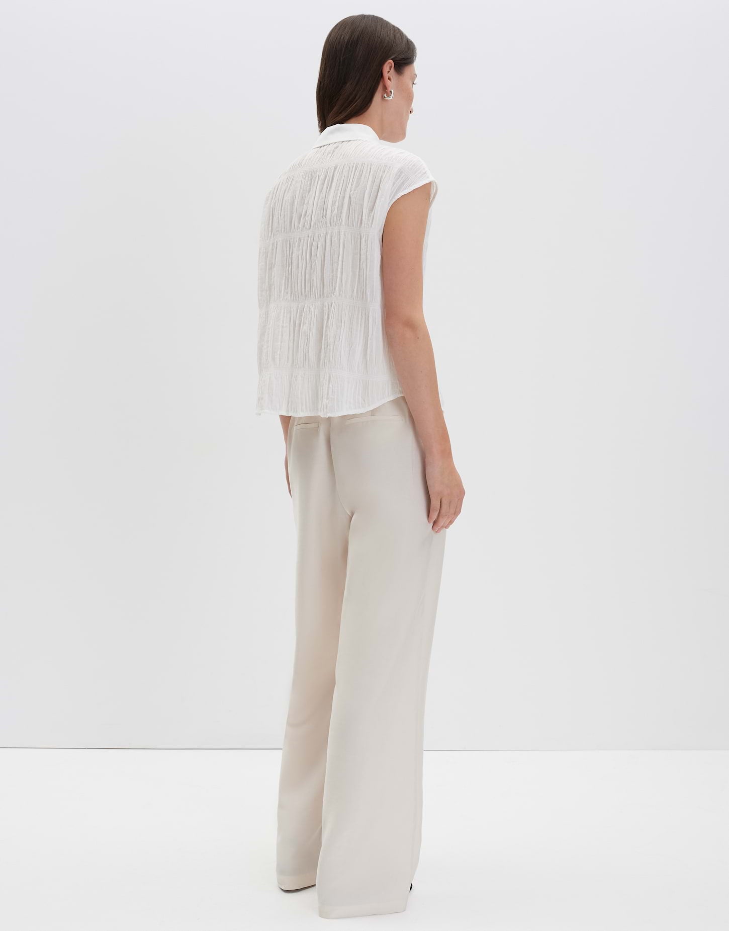 normale Passform, figurbetont geschnitten, leicht verkürzt geschnitten, überschnittener Kurzarm, Hemdblusenkragen, Rückenlänge ca. 58 cm bei Größe 36, Model Größe 177 cm – trägt Größe 36, Webware, enthält nichttextile Teile tierischen Ursprungs, plissierte Struktur, leichter Stoff, leichte Transparenz, Knopfleiste vorn, Perlmuttknöpfe