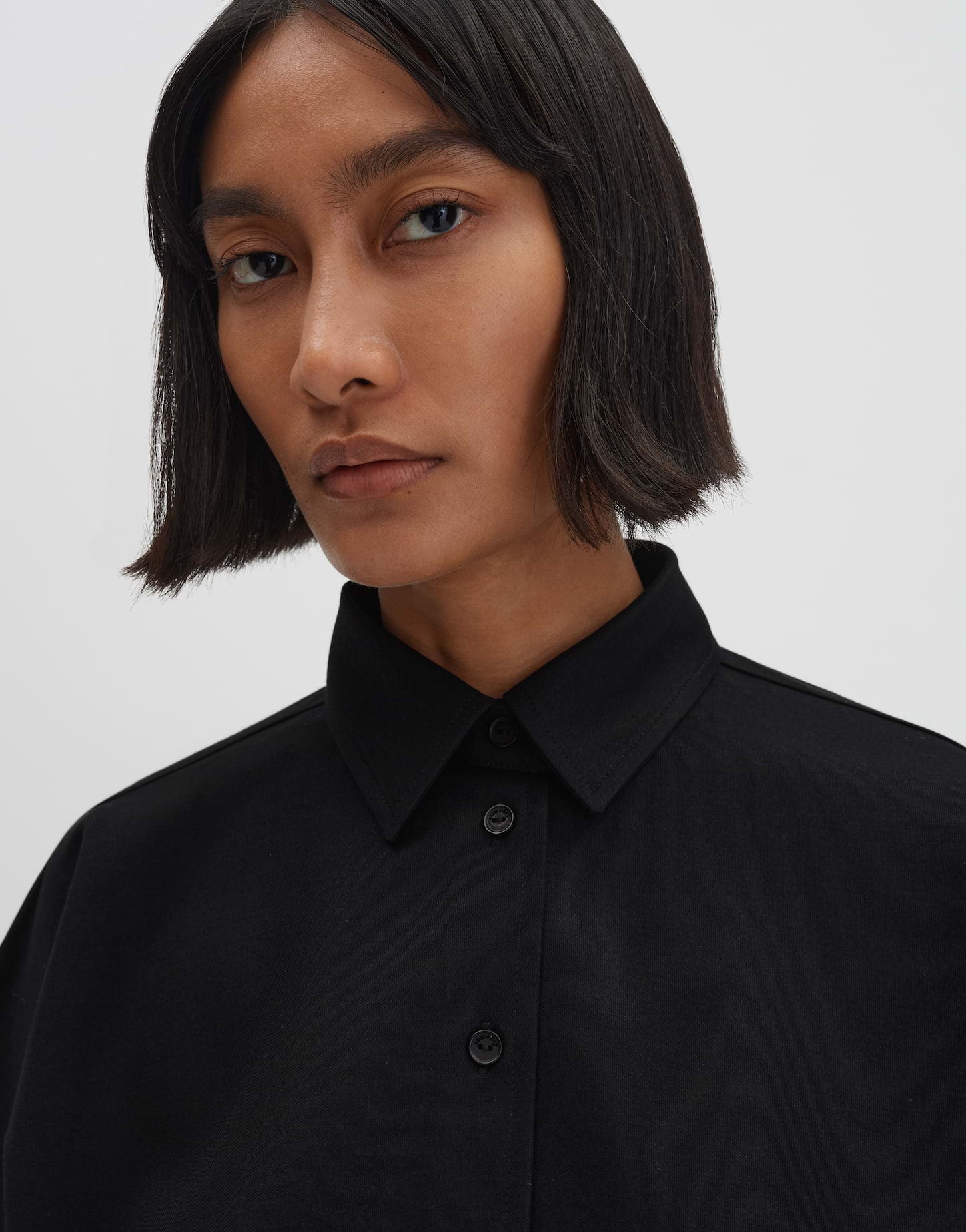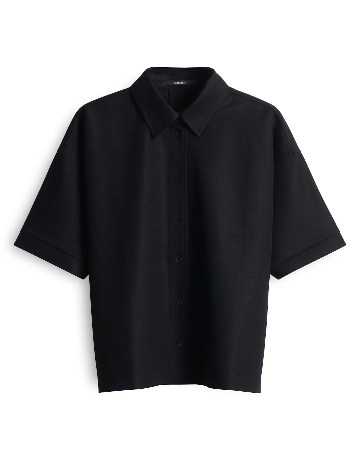 weite Passform, Boxy Fit, leicht verkürzt geschnitten, überschnittener Halbarm, Hemdblusenkragen, Rückenlänge ca. 55 cm bei Größe S, Model Größe 176 cm – trägt Größe S, Jersey, fester Griff, elastischer Stoff, fließender Fall, Kellerfalte im Rücken, Knopfleiste vorn